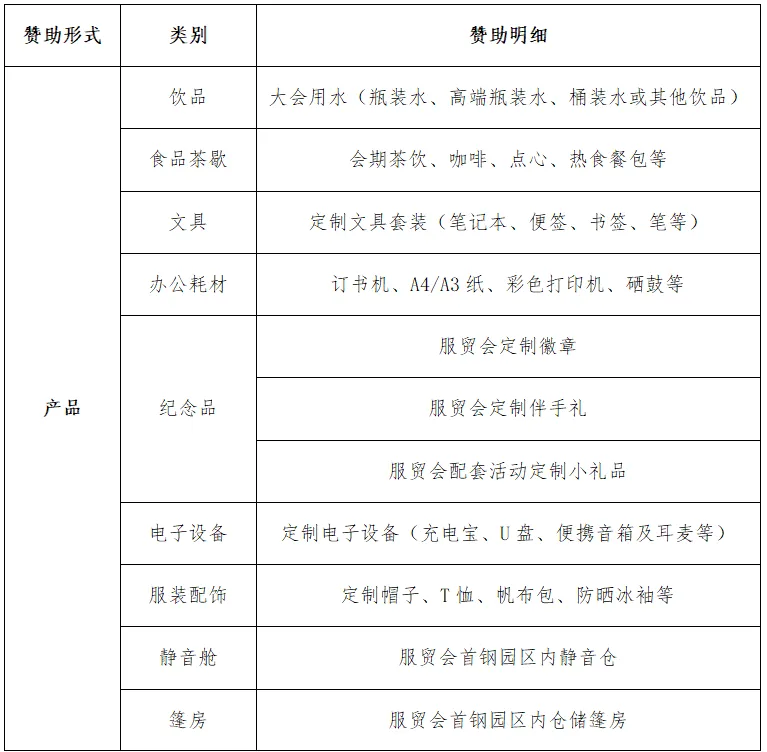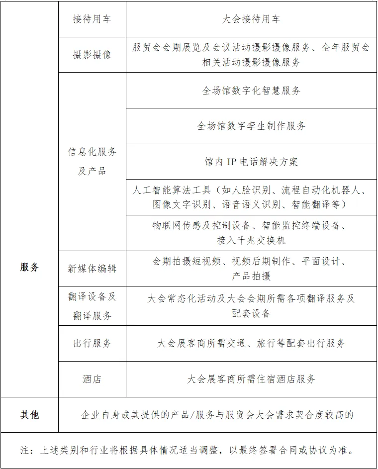 饮品、食品茶歇、文具、办公耗材、纪念品、电子设备、服装配饰、静音舱、篷房、接待用车、摄影摄像、信息化服务及产品、新媒体编辑、翻译设备及翻译服务、出行服务、酒店或其他与服贸会需求契合度高的产品或服务。