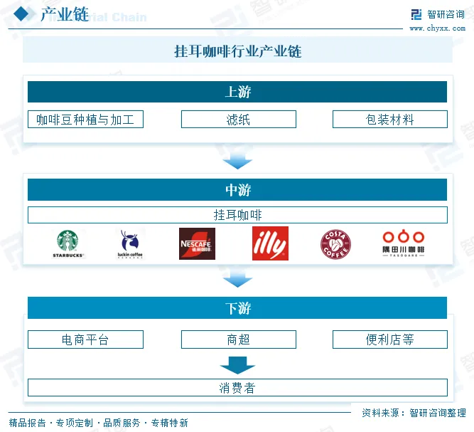 从产业链来看,挂耳咖啡行业上游为咖啡豆的种植与加工,目前国内咖啡豆种植区主要集中在云南等地;此外还包括滤纸、包装材料等。中游是指挂耳咖啡的生产。下游是指销售渠道,包括线上电商平台、线下商超、便利店等,通过这些渠道最终将产品销售给终端消费者。