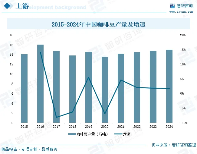 咖啡豆是挂耳咖啡的核心原料,我国咖啡豆种植主要集中在云南与海南,其中云南省是我国最大、最重要的咖啡豆生产基地,咖啡种植面积及生豆产量均占全国97%以上,并逐步形成了集种植、生产、加工于一体的发展格局。近年来,我国咖啡豆产量呈现波动上升趋势,2024年中国咖啡豆产量达到15万吨,同比上涨1.74%。这一方面得益于灌溉、耕种等技术的革新,有效解决了咖啡种植中水分不足、病虫害等问题,推动产量提升;另一方面,云南等产地通过补贴、基建投入等政策,为咖啡种植提供保障,推动产量增长。预计未来随着市场需求的增长,咖啡豆产量有望继续上涨。