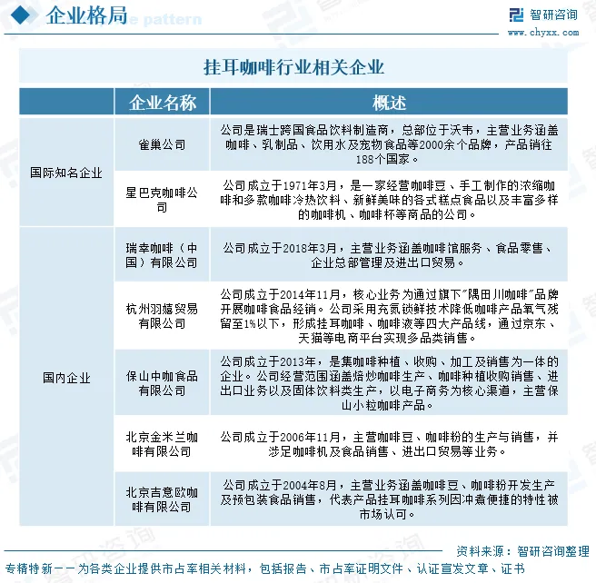 挂耳咖啡市场吸引了众多国内外品牌的参与。国际知名品牌如雀巢、星巴克等凭借强大的品牌影响力和优质的产品,占据了市场的主导地位;而国内新兴品牌则通过差异化发展,推出特色产品,吸引消费者的关注。目前国内相关企业主要包括瑞幸咖啡(中国)有限公司、杭州羽嬉贸易有限公司、保山中咖食品有限公司、北京金米兰咖啡有限公司、北京吉意欧咖啡有限公司等。