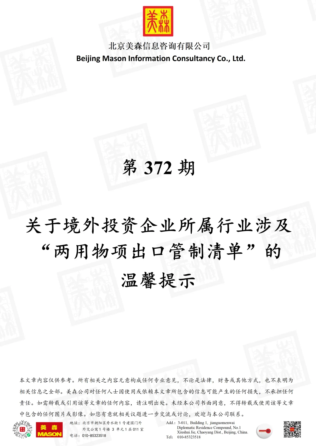 本文章内容仅供参考。所有相关之内容无意构成任何专业意见,不论是法律,财务或其他方式,也不表明为相关信息之全部。美森公司对任何人士因使用或依赖本文章所包含的信息可能产生的任何损失,不承担任何责任。如需转载或引用该等文章的任何内容,请注明出处。未经本公司书面同意,不得转载或使用该等文章中包含的任何图片或影像。如您有意就相关议题进一步交流或讨论,欢迎与本公司联系。