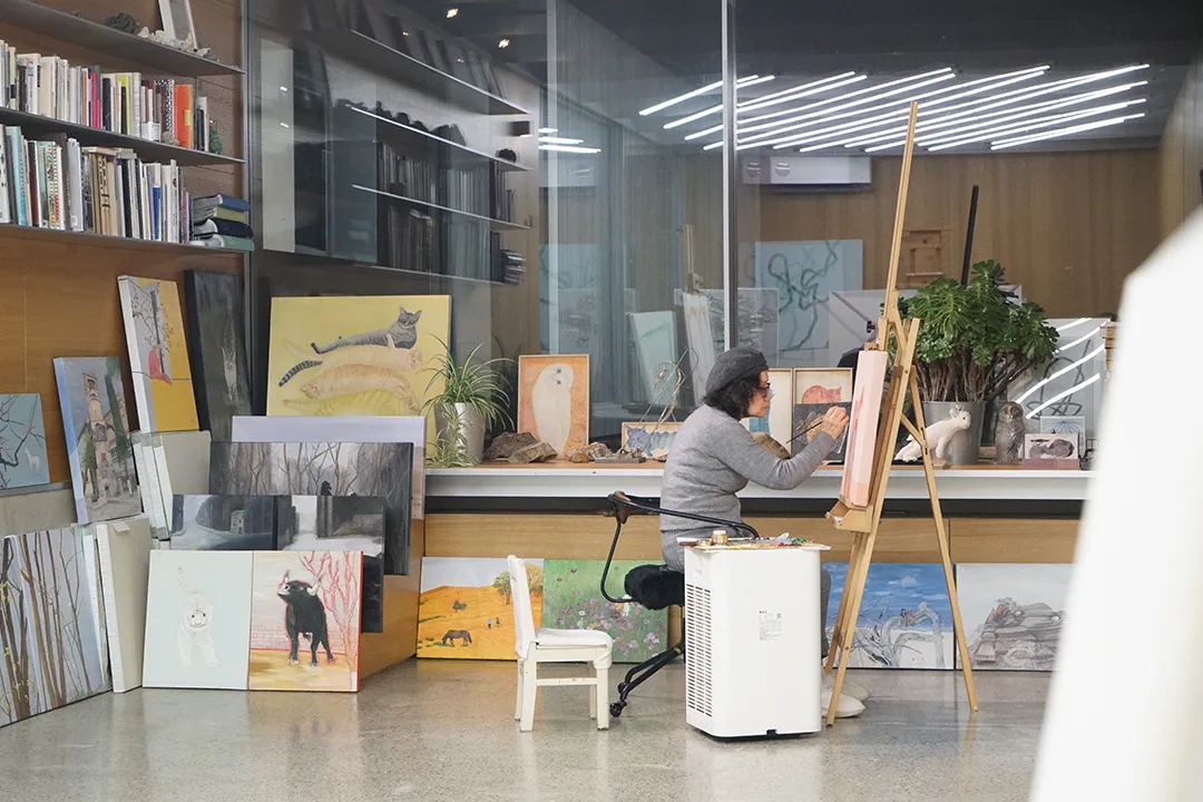 诚如笛笛所言,当人们在画布上堆砌意义、隐喻时代,却唯独忘记了如何去看一朵花时,李定英只是极其本能地,去画她路过的风景,去画家里打盹的猫,去画那只出了车祸流下眼泪的流浪狗。旅行到了格鲁吉亚,钟楼不让游客登顶,她觉得遗憾,便干脆在画里让一只猫纵身跃上屋顶——既然现实有那么多规矩,那就在画布上给自己飞檐走壁的自由。