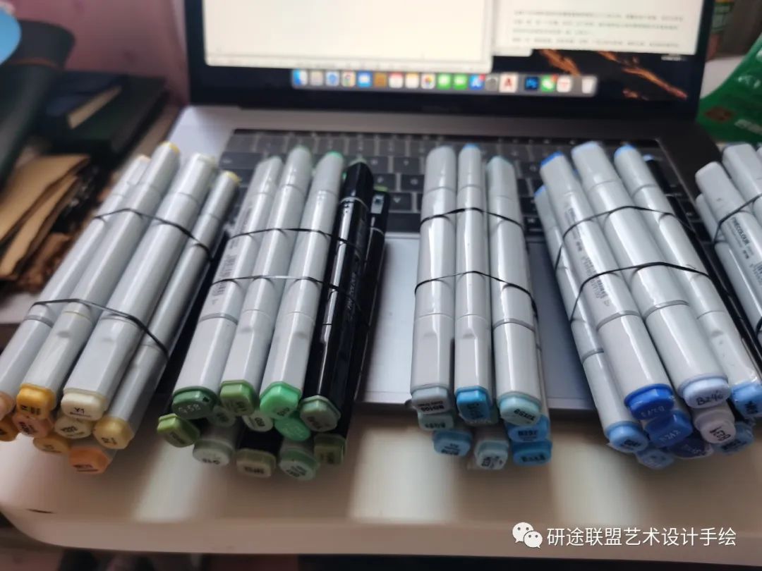 关于提速,我后期的一个方式就是用小皮筋儿把一个色系的笔都捆在一起,需要用的时候就一整捆拿出来把全部需要这个颜色的部分一起画完,可以节省在笔袋里找笔的时间。