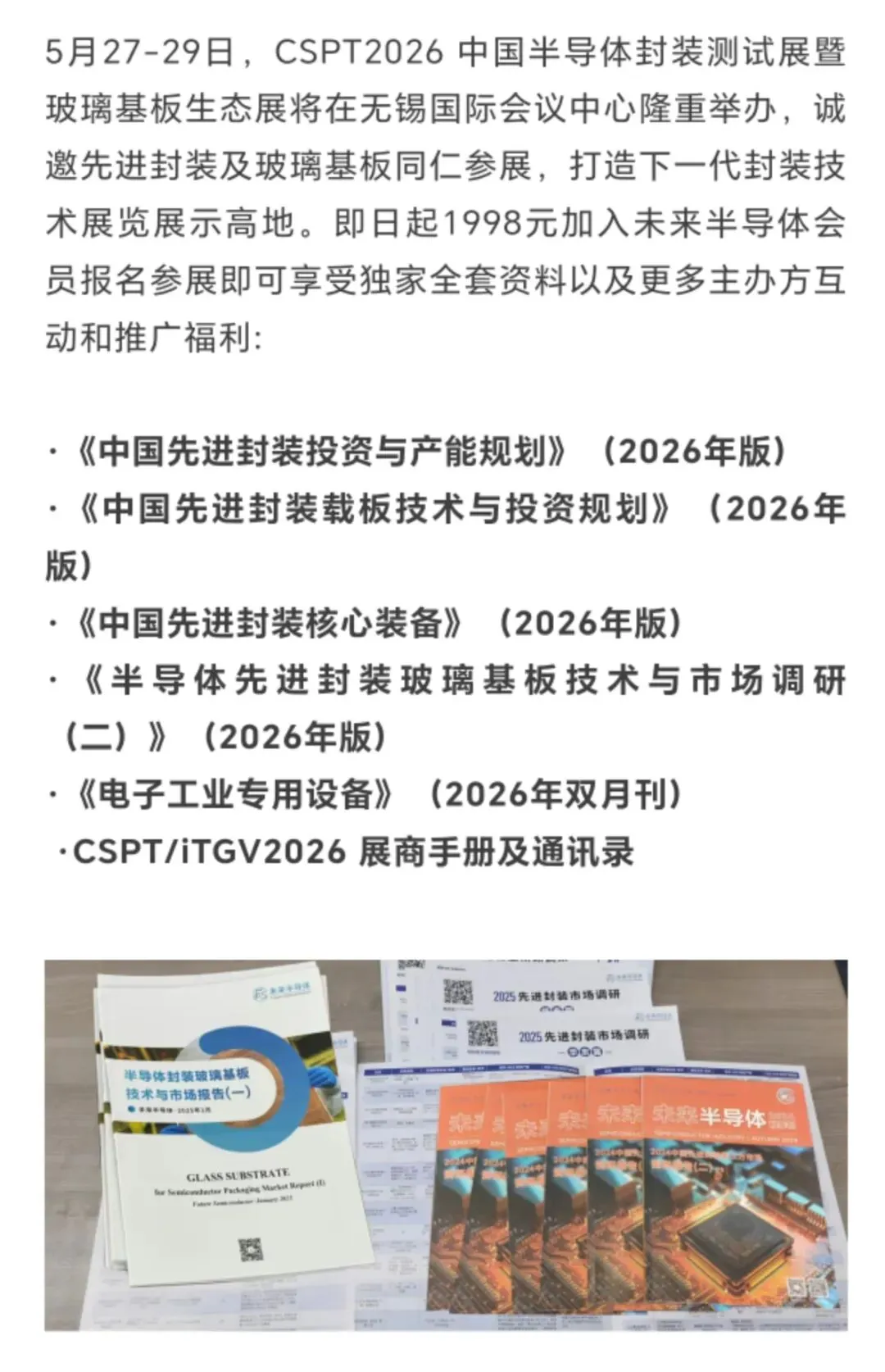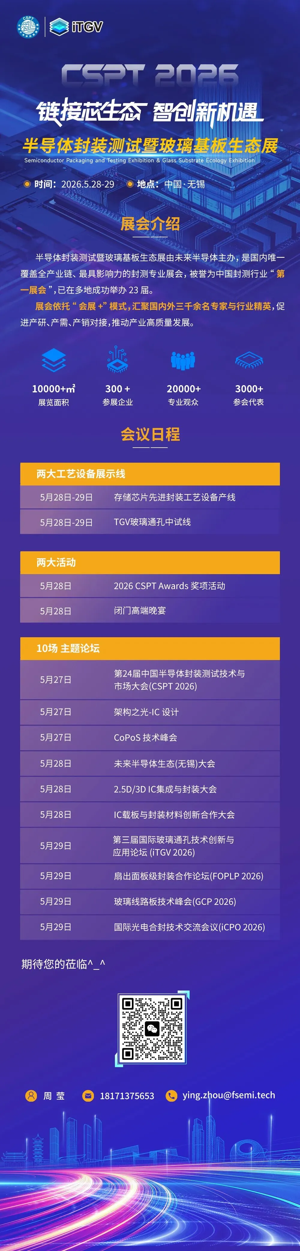 5月27-29日,CSPT2026 中国半导体封装测试展暨玻璃基板生态展将在无锡国际会议中心隆重举办,诚邀先进封装及玻璃基板同仁参展,打造下一代封装技术展览展示高地。