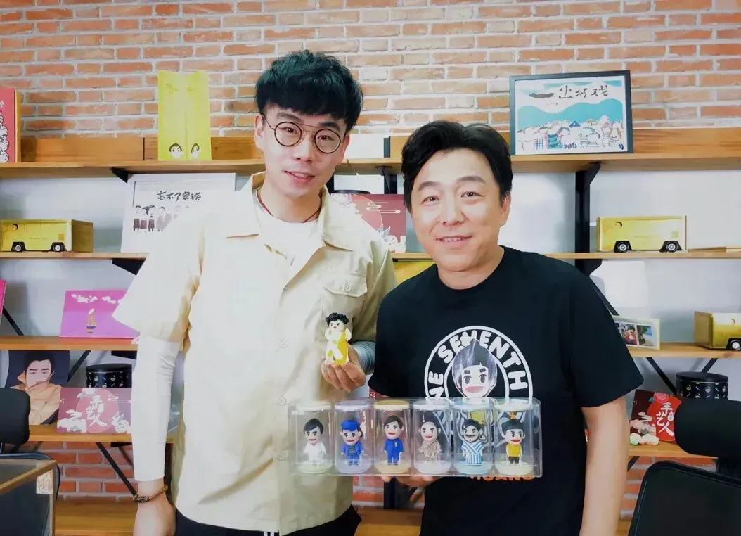 北京“面人郎”第三代传承人郎佳子彧(左)和演员黄渤(右)