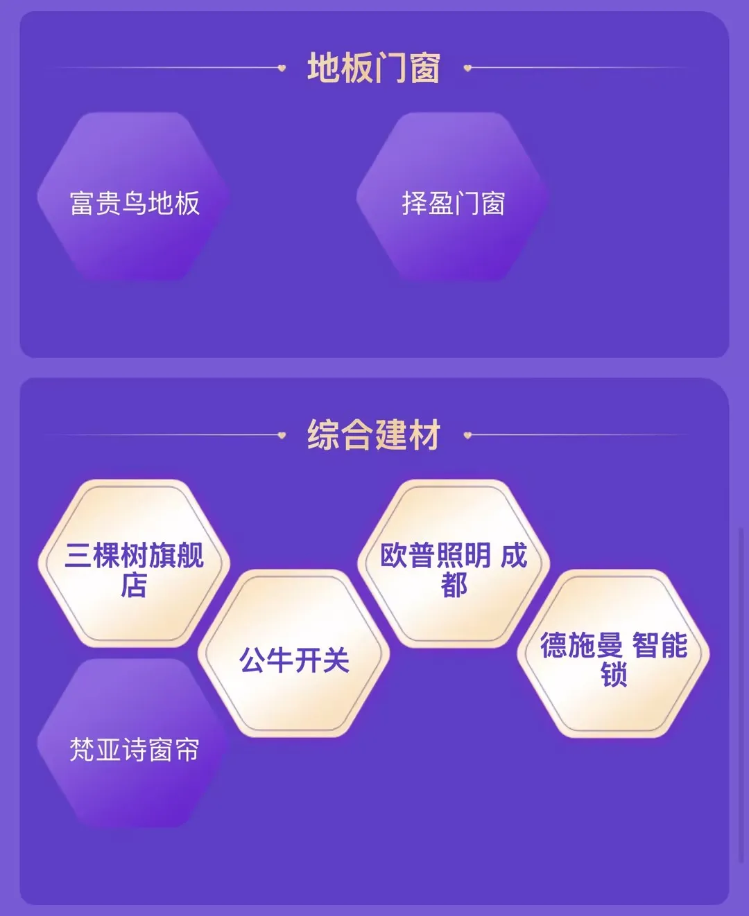 综合装饰:油漆涂料、壁纸家饰、各类管材、装饰玻璃、吊顶灯饰、装饰五金、锁具、开关电器等