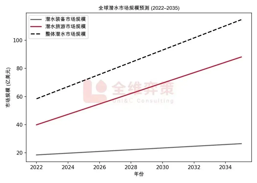 如果把设备市场规模与水肺潜水旅游、培训认证等其他环节叠加,整体潜水产业的体量则更大。部分市场研究认为全球潜水旅游单独的市场规模已经达到40亿–80亿美元区间,并仍在稳健增长 。这说明,仅设备端并不能代表整个行业的规模,而旅游、培训、内容等增值环节正贡献越来越重要的收入。