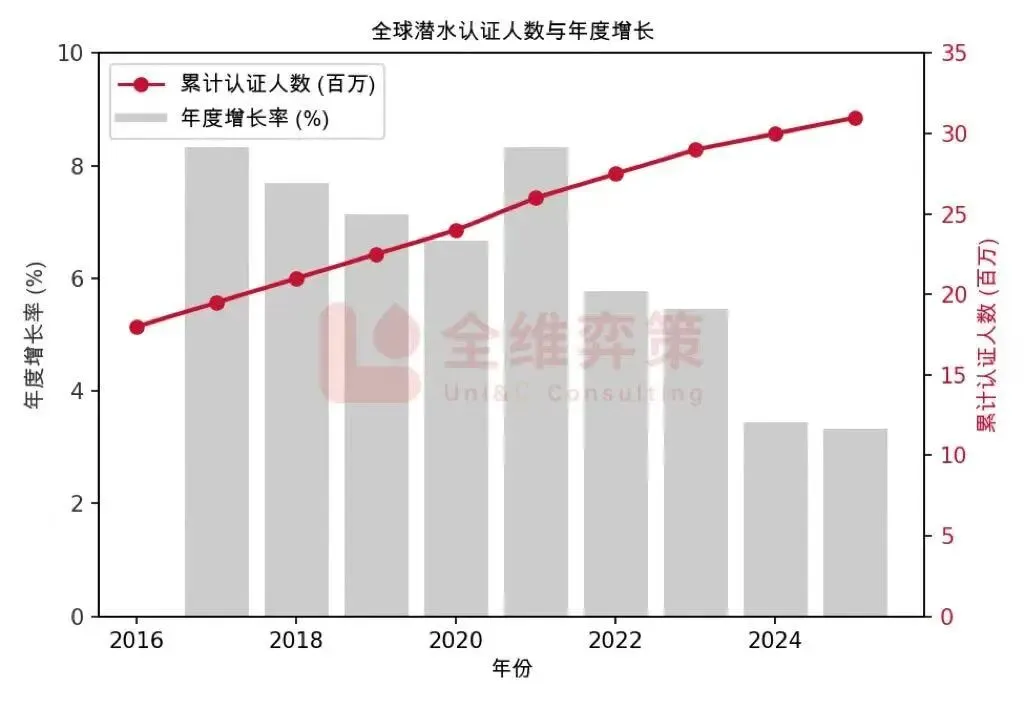 与此同时,潜水培训体系与潜水旅游服务的不断成熟,也在逐步降低初次参与的门槛,使更多非传统潜水爱好者开始尝试进入这一领域。