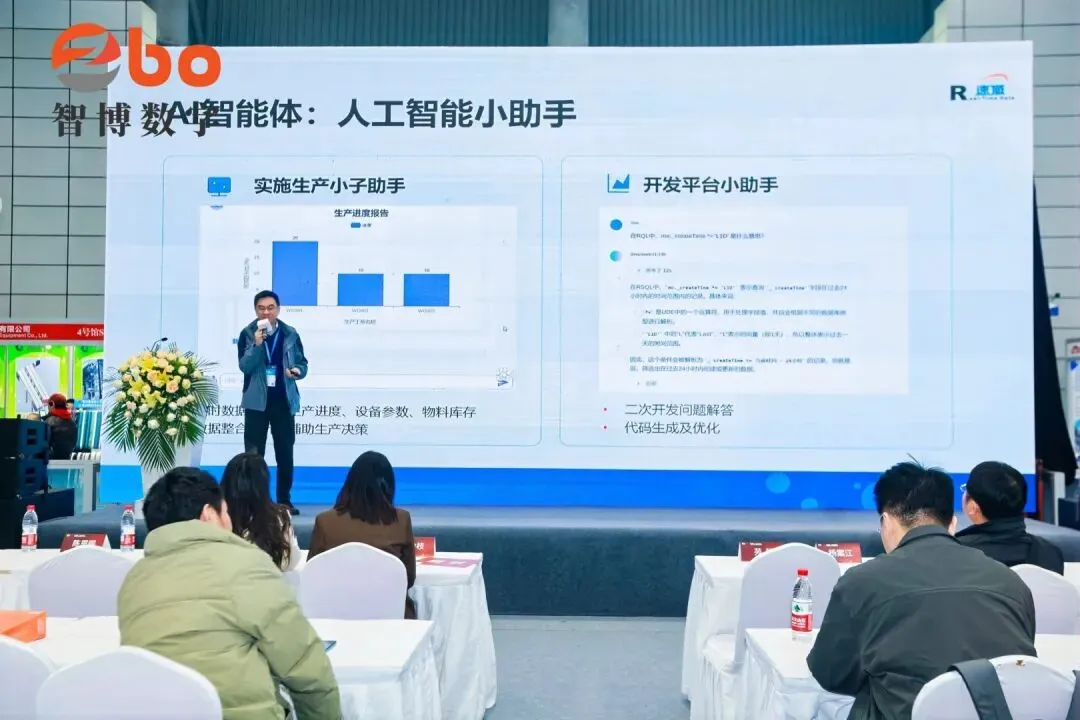 演讲直面传统制造的痛点,系统阐述了速威智能以“AI+MES”为核心的破局之道,重点分享了AI应用场景如何为企业带来切实价值。这些智能化场景的落地,离不开速威智能强大的技术底座——FlexWeaver云原生低代码工业PaaS平台。演讲中重点提到,FlexWeaver平台深度融合了DeepSeek/ChatGPT等人工智能引擎,不仅提供了可视化的工艺建模、微流(MicroFlow)构建和丰富的工业组件库,更创新性地集成了“AI智能体”,让AI能力深度融入开发、实施与生产运营等流程中。