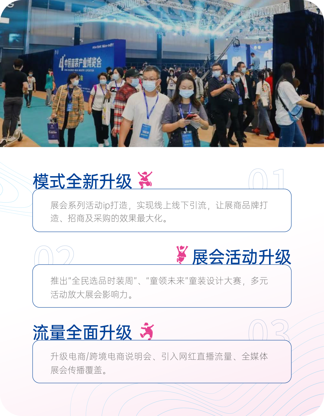 中国童装产业博览会(缩写:CCWIE,简称“童博会”)是国内最早专注于童装产业的全产业链博览会,自2019年首次举办以来,目前展会规模已达5万平米,单届参展企业超过800家、品牌1500余个,专业观众人数超过25000人次。