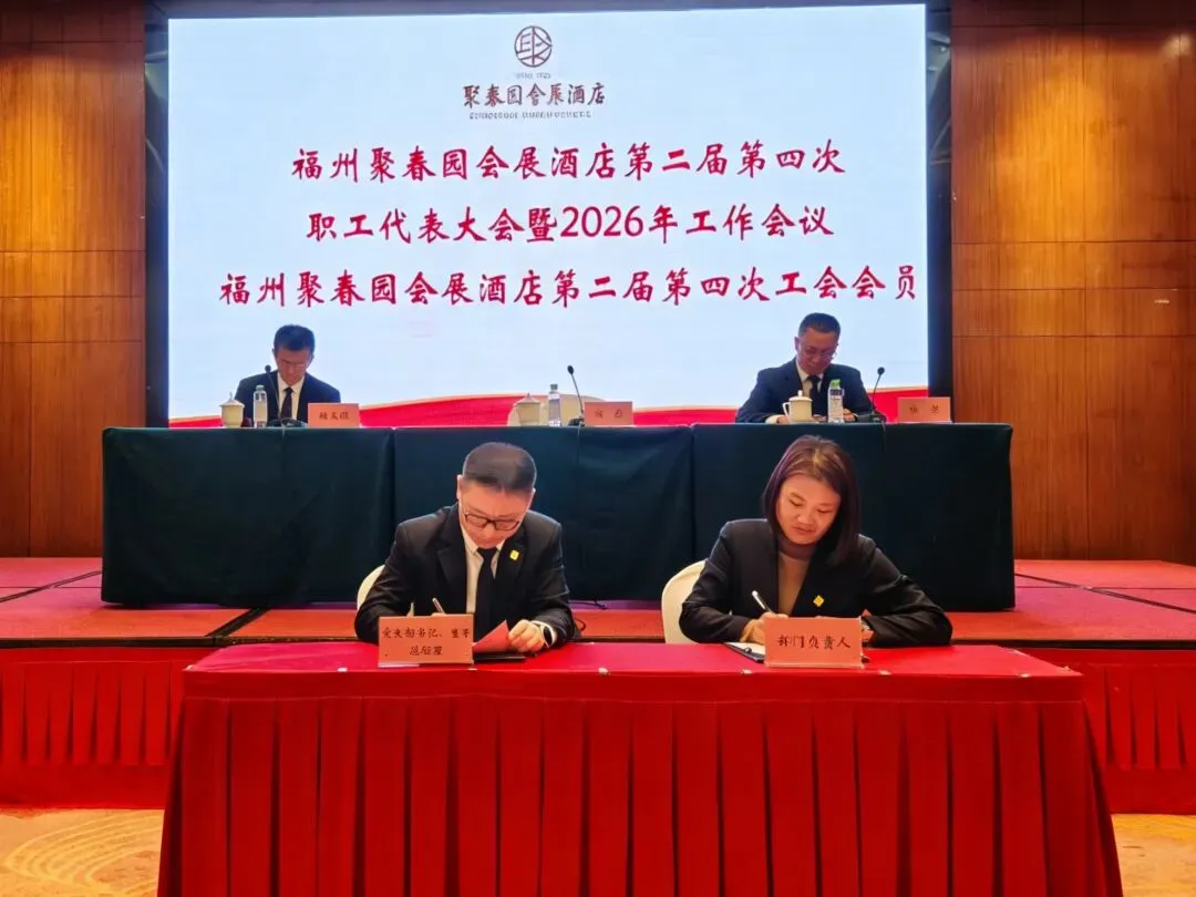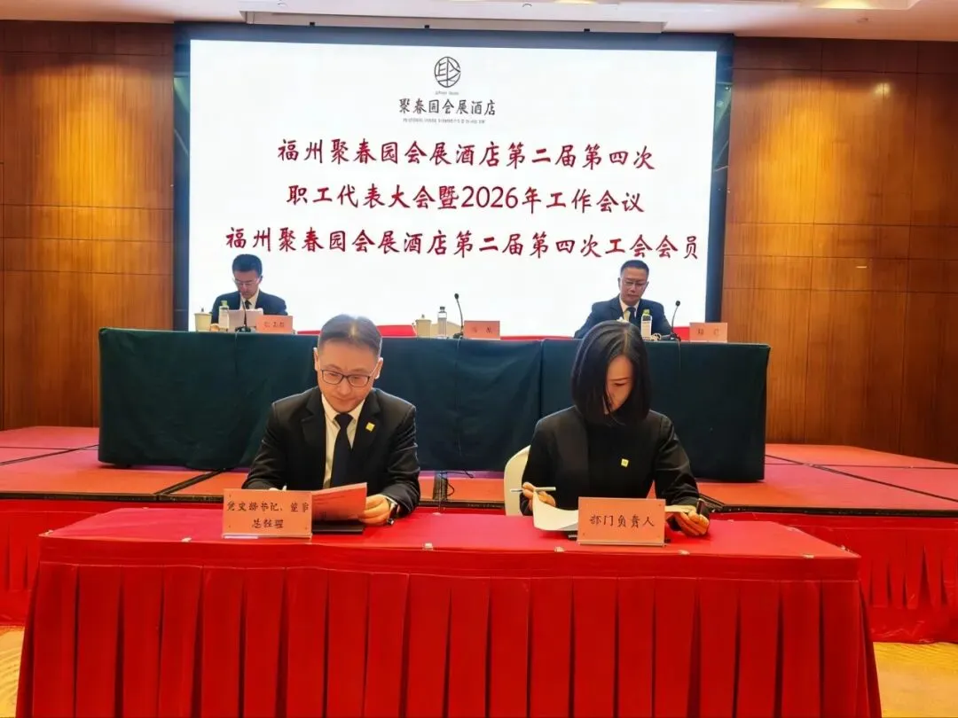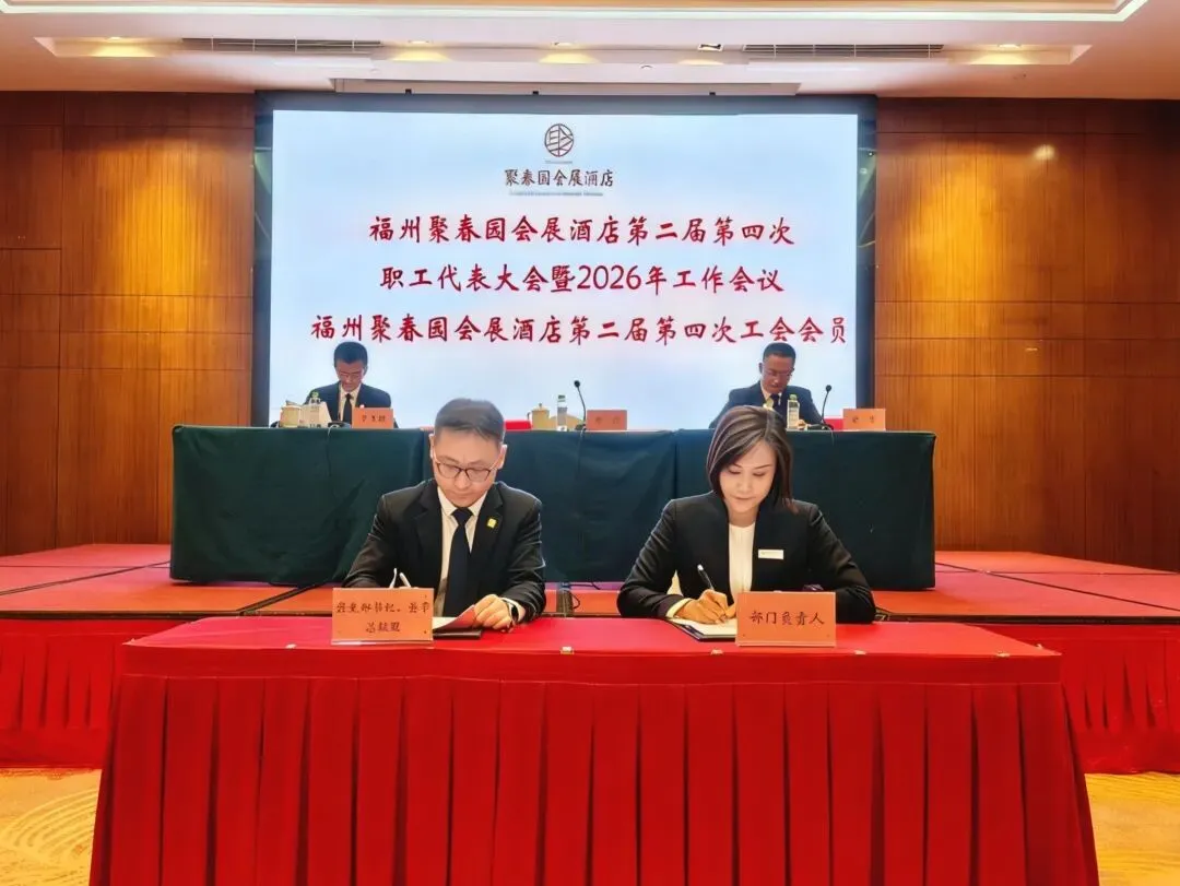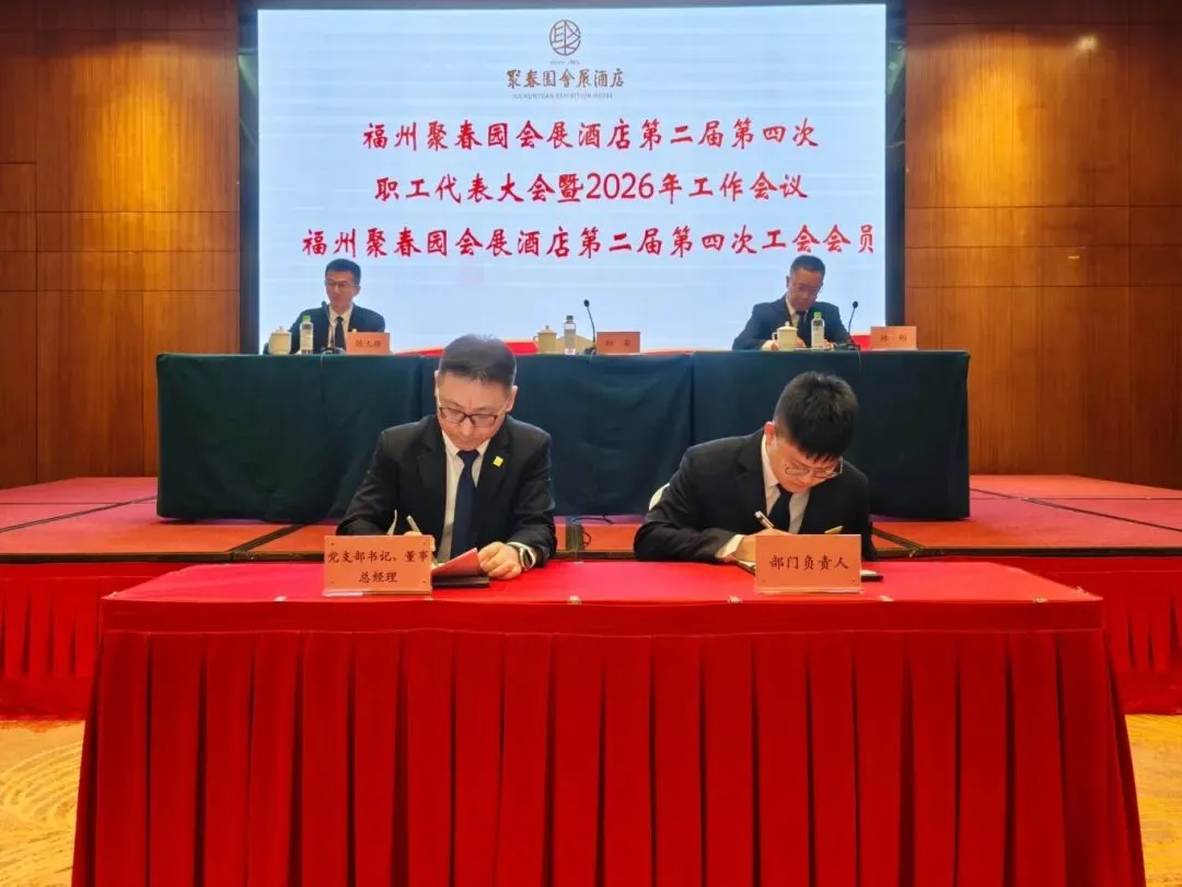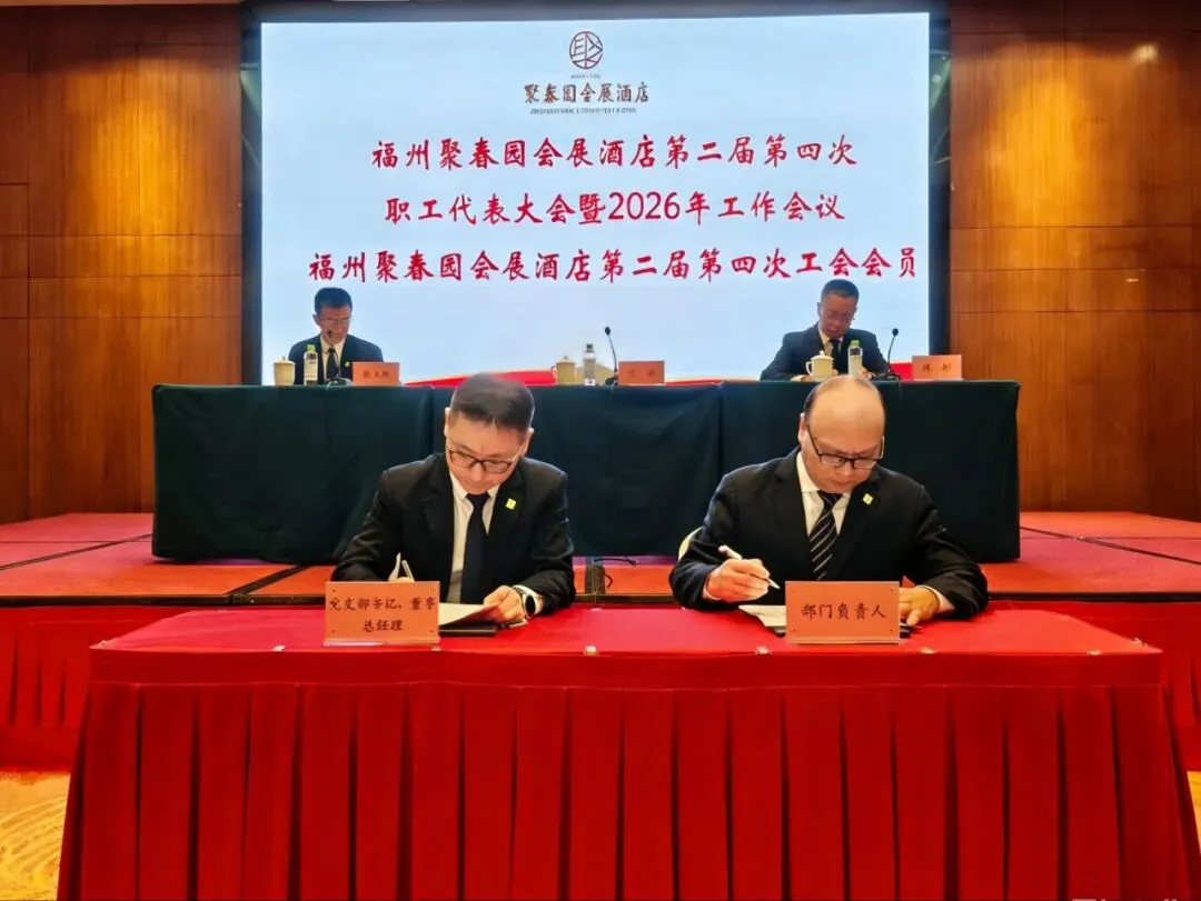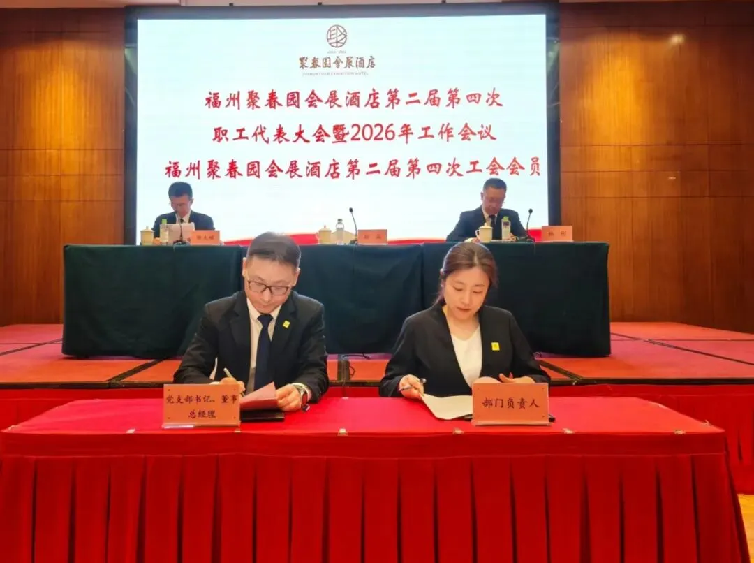 3月11日,福州聚春园会展酒店召开第二届第四次职工代表大会暨2026年工作会议、第二届第四次工会会员代表大会顺利召开。大会表彰了酒店2025年度集团先进工作(生产)者,听取和审议了酒店2025年工作总结及2026年工作思路的报告,审议通过了酒店工会“三委”工作报告、《福州聚春园会展酒店有限公司薪酬管理制度》,签订了2026年度各项工作目标责任书。54名正式代表出席会议。酒店党支部书记、董事、总经理顾淼及经营班子成员全体参加,酒店副总经理、工会主席陈大樑主持会议。