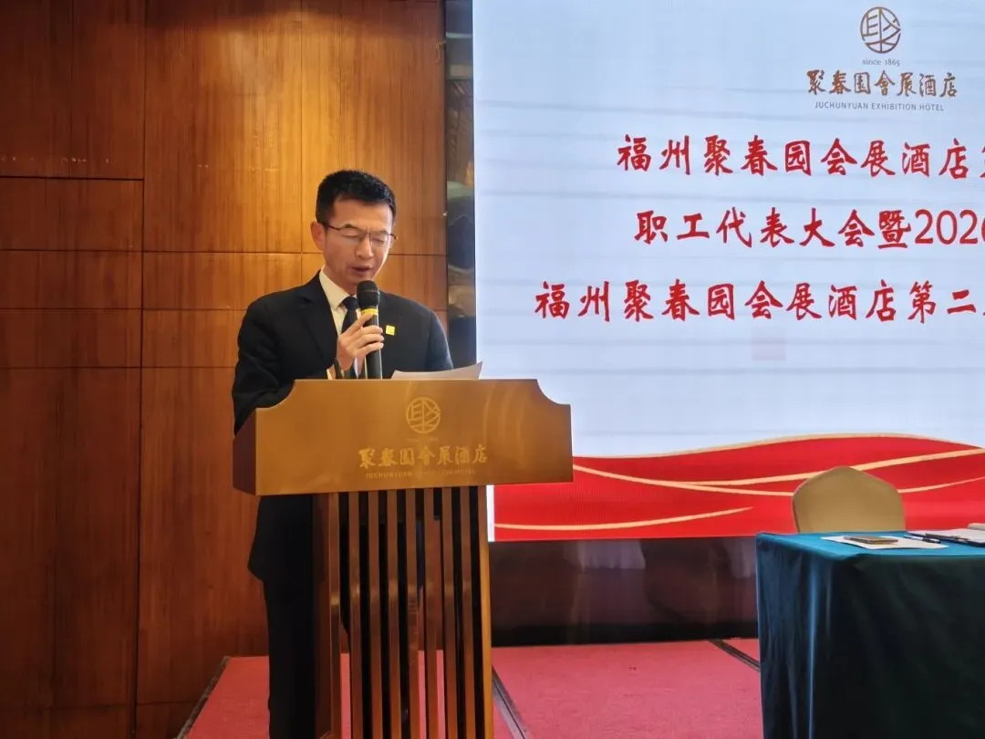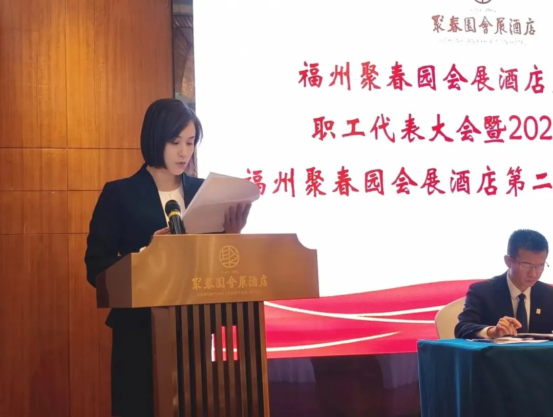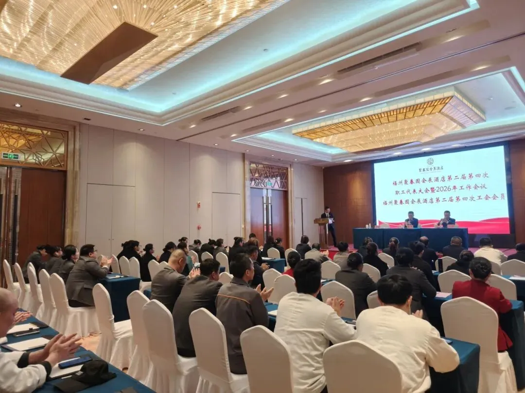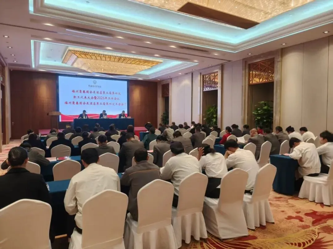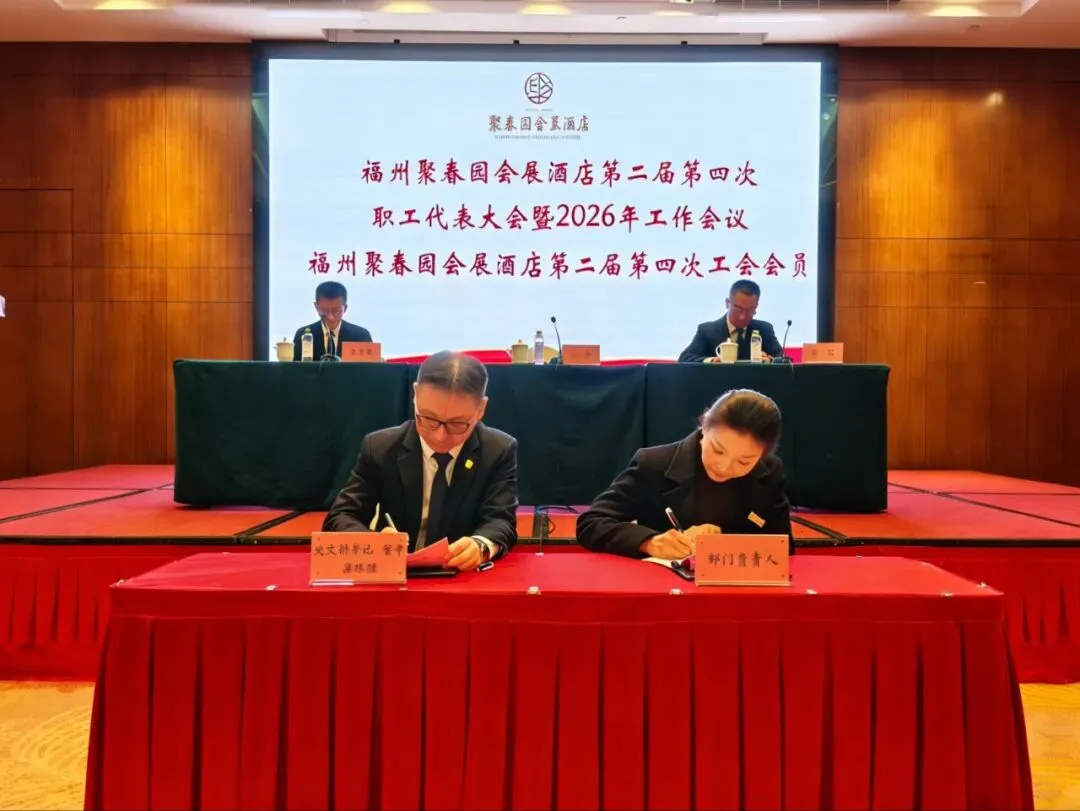 3月11日,福州聚春园会展酒店召开第二届第四次职工代表大会暨2026年工作会议、第二届第四次工会会员代表大会顺利召开。大会表彰了酒店2025年度集团先进工作(生产)者,听取和审议了酒店2025年工作总结及2026年工作思路的报告,审议通过了酒店工会“三委”工作报告、《福州聚春园会展酒店有限公司薪酬管理制度》,签订了2026年度各项工作目标责任书。54名正式代表出席会议。酒店党支部书记、董事、总经理顾淼及经营班子成员全体参加,酒店副总经理、工会主席陈大樑主持会议。