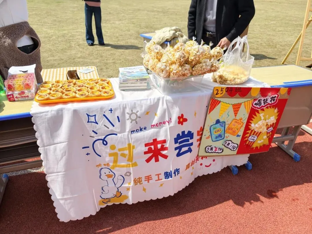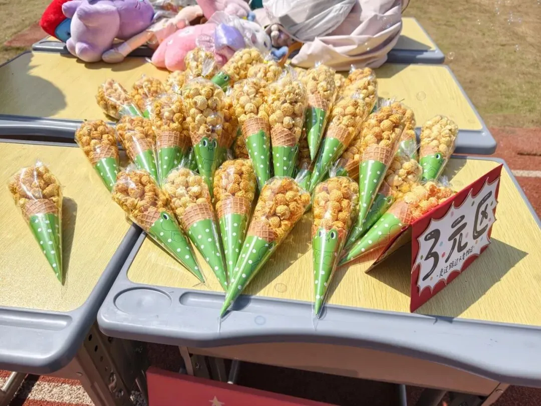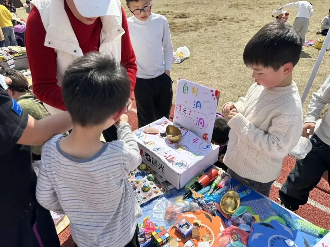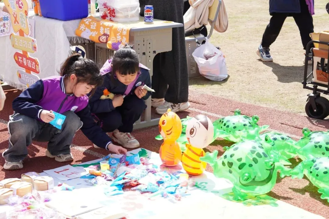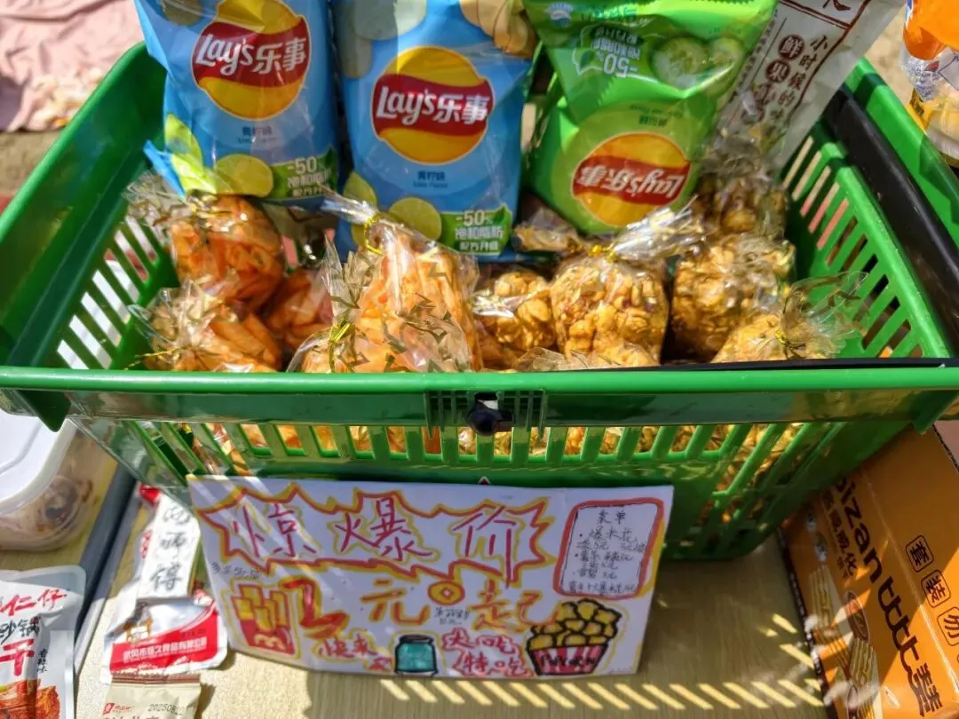 每一个“摊主”都是一道独特的风景。摊位上,手绘海报与亮片彩带交相辉映,废旧纸箱变身创意招牌,充分展现了孩子们的无限创意与环保理念。