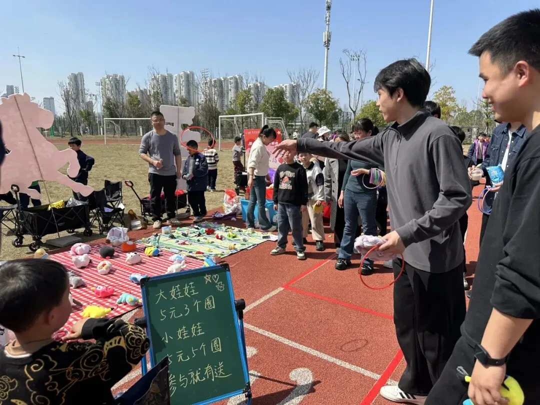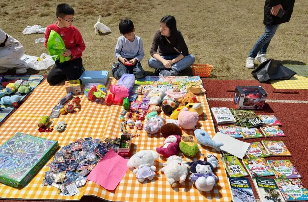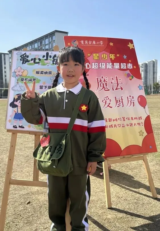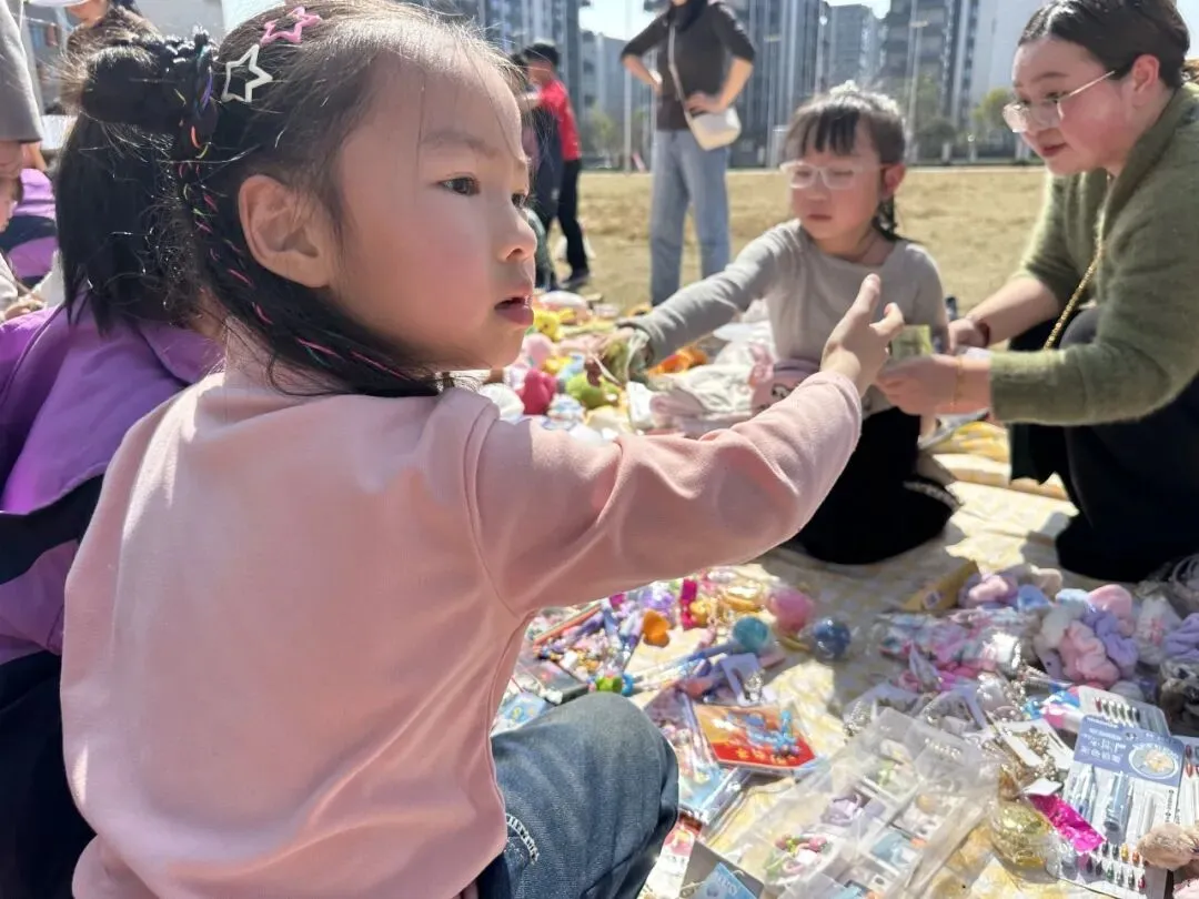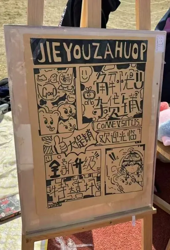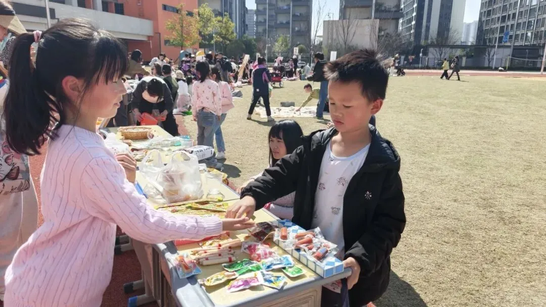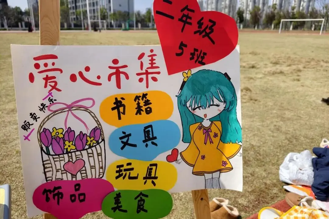 每一个“摊主”都是一道独特的风景。摊位上,手绘海报与亮片彩带交相辉映,废旧纸箱变身创意招牌,充分展现了孩子们的无限创意与环保理念。