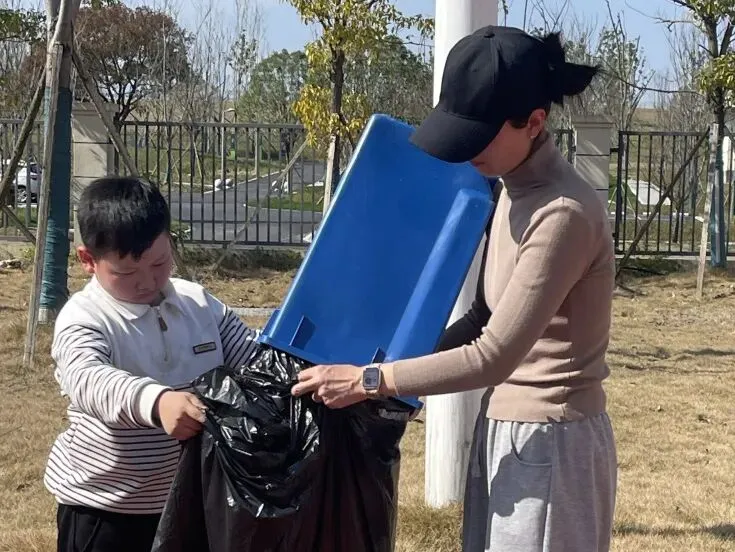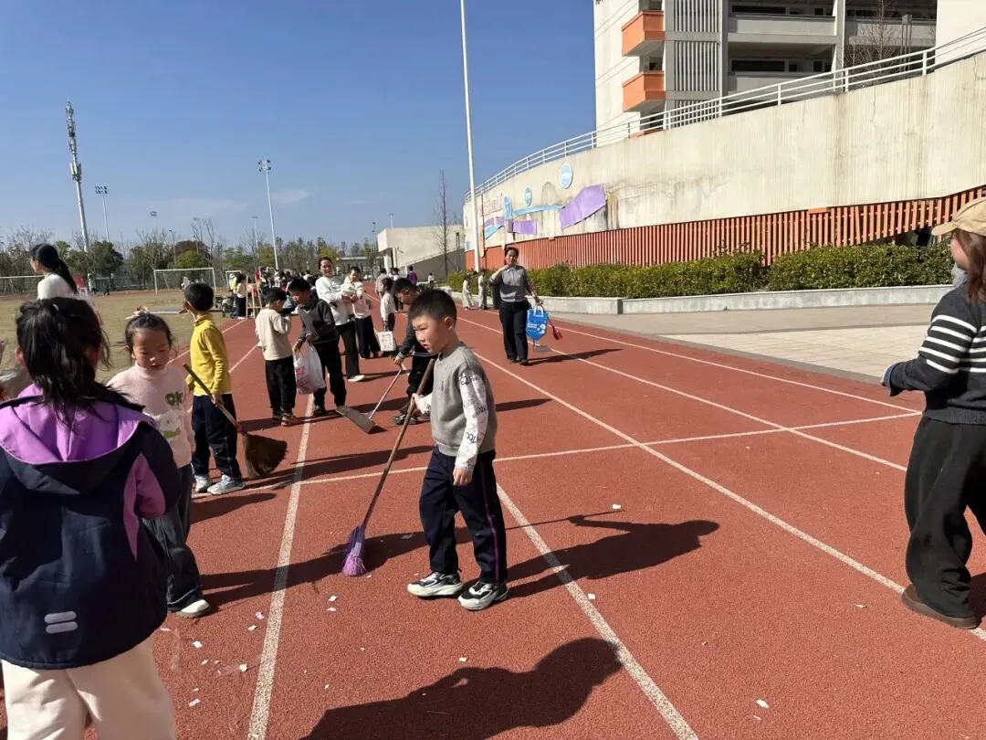 老师们带着家长和孩子们,拿着扫帚和垃圾袋,弯着腰仔细清理每一个角落。2301班的田沐言、2201班的肖雪、2402班的谭鑫玥……越来越多的孩子默默加入,捡起地上的包装纸,连草坪缝隙里的小碎片都不放过。这些可爱的孩子们,用一次次弯腰,让操场恢复了活动前的模样。