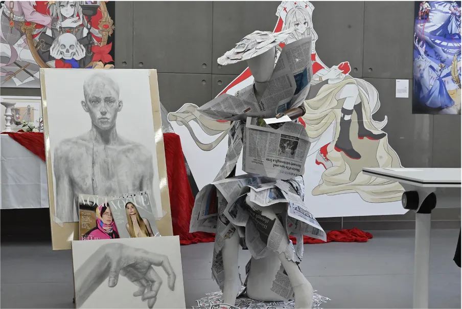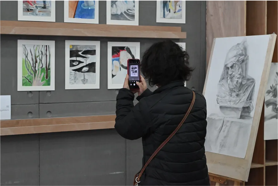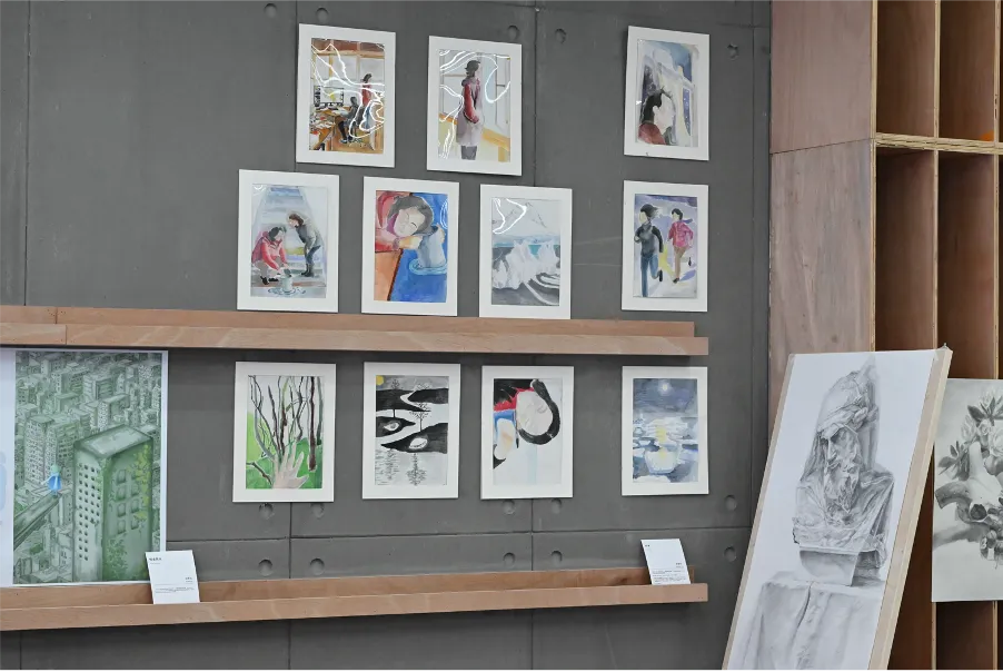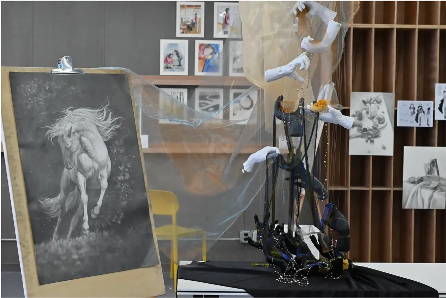 本次毕业设计展集中展示了高三艺术生的阶段创作成果。展览现场既有绘画类作品,也有结合不同材料与空间形式创作的艺术装置作品,呈现出多样化的艺术表达方式。不同类型的作品从主题构思到表现形式各具特色,既体现了学生们在专业学习中的扎实基础,也展现了他们对于艺术语言的个人理解。