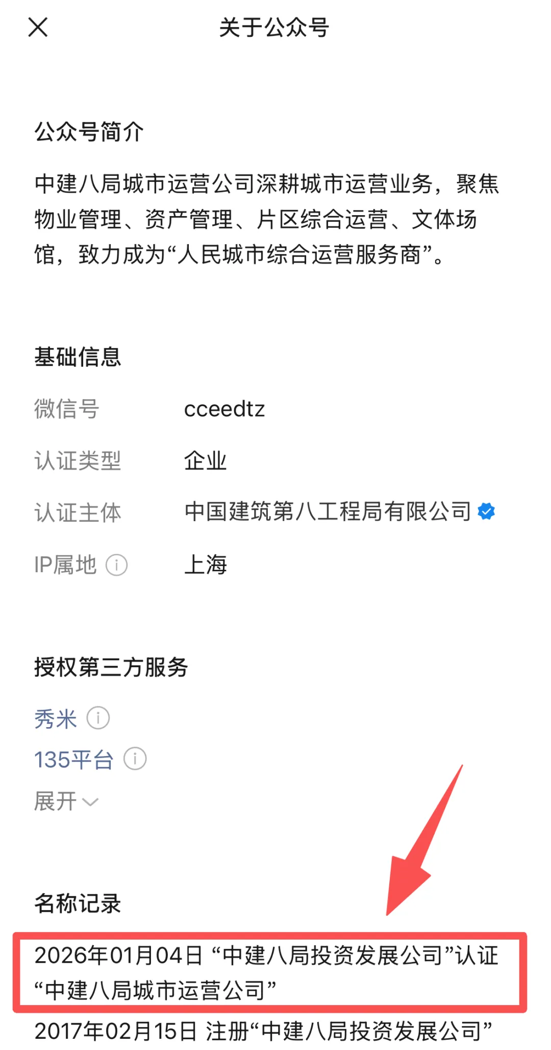 今年年初,中建八局旗下投资发展公司的微信公众号已于2026年1月更名为“中建八局城市运营公司”。