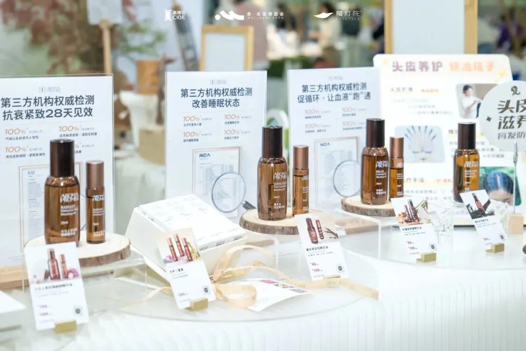 现场备受关注的疗愈产品,包括各种进口精油产品、中式药材精油、香薰蜡烛、精油香水、颂钵及水晶钵、卡牌、微压氧舱、科技头环、营养保健食品等,以及各种疗愈服务培训与门店赋能陪跑服务,都是众多美业、大健康产业机构负责人想要引进和合作的项目。