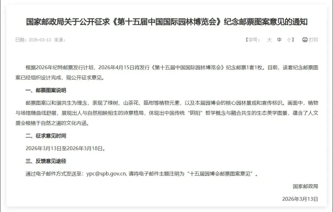 二、征求意见时间2026年3月13日至2026年3月18日。三、反馈意见途径通过电子邮件方式发送至:ypc@spb.gov.cn, 请将电子邮件主题注明为“十五届园博会邮票图案意见”。