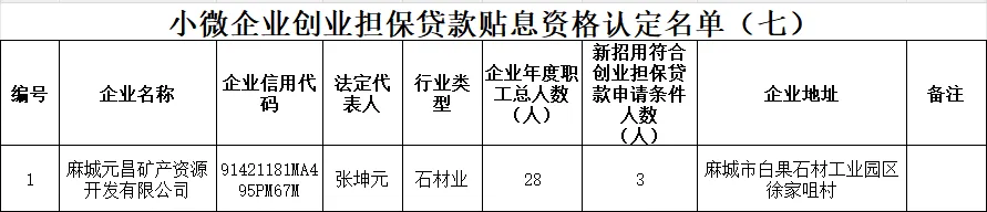 为进一步优化营商环境,持续释放创业带动就业的倍增效应,切实解决小微企业“融资难、融资贵”问题,根据国家统计局关于印发《统计上大中小微型企业划分办法(2017)的通知》(国统字〔2017〕213号)、财政部《普惠金融发展专项资金管理办法》(财金〔2023〕75号)及省财政厅《关于明确创业担保贷款财政贴息有关政策标准的通知》(鄂财金发〔2023〕34号),现对2026年度第七批小微企业创业担保贷款贴息资格认定已审核通过的1家企业名单进行公示。如发现有企业不符合相关政策规定,请向麻城市劳动就业服务中心反映,经认定公示不存在异议的小微企业名单将提交至下一步流程审核。