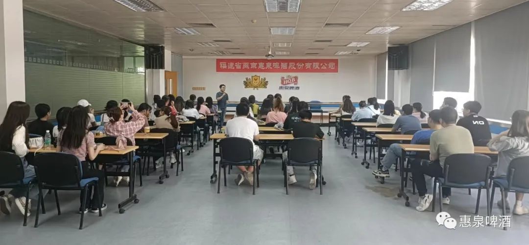周副校长带着学生们参观了公司厂区及啤酒生产车间,一进厂区,同学们就被这所充满了现代化气息的花园式工厂深深吸引,赞叹不已;走进生产车间,同学们又被先进的啤酒生产设备、先进的工艺技术所折服,他们认真倾听讲解,时而兴奋地相互讨论,交流着彼此的感受…… 随后,同学们来到公司会议室,技术研发处处长郑翔鹏向同学们详细介绍了惠泉公司的发展历程以及一麦、小鲜、欧骑士、初念精酿啤酒等主要产品的特色和产品研发情况,并与他们亲切交流,希望大家能更多地了解啤酒的生产,学以致用,积极投入到科研领域,也欢迎大家加入惠泉的研发团队。