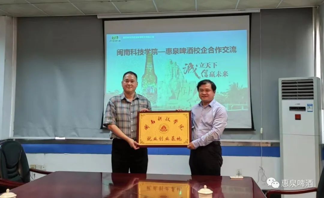 会后,周勇军副校长与刘翔宇董事长在第二会议室举行闽南科技学院就业创业基地授牌仪式。闽南科技学院就业创业基地的成立,将积极推动闽南科技学院与惠泉啤酒公司的深度融合,双向提升。在深度发展过程中,以此为契机,通过产学结合、资源共享、优势互补、互惠共赢,形成产学研用多联动的校企合作新模式。同时,周副校长也欢迎公司选派高技能人才和管理人员到学校做专题讲座或企业推介活动,让“双师型”成为推动双向合作的点睛之笔。