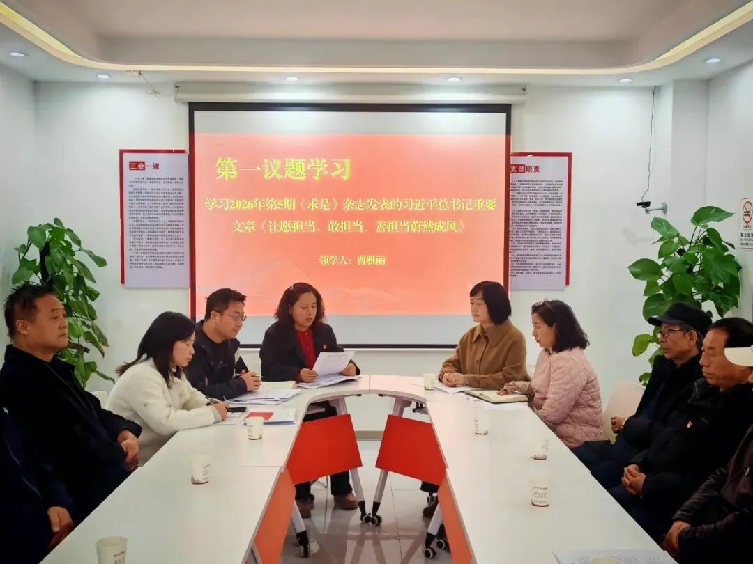 活动严格落实"第一议题"制度,社区党总支书记曹雅丽同志领学2026年第5期《求是》杂志发表的习近平总书记重要文章《让愿担当、敢担当、善担当蔚然成风》,引导全体党员强化担当意识、提升履职能力。