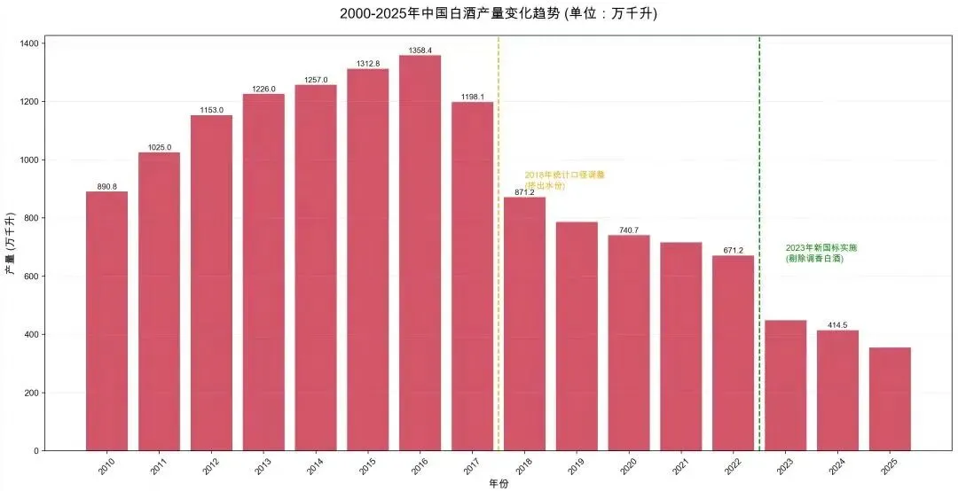 国家统计局数据显示:2025年全国白酒产量约354.8万千升,同比下降12.1%。