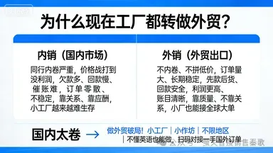 近些年来国内市场太卷了,价格压到没利润,欠款多、回款慢,同行杀价杀到亏本,小工厂、小作坊越干越难。与其在内销里死磕,不如做外贸破局!想多接单、多赚钱,做外贸,就是最稳的一条路。外贸订单更大、更稳定国外客户大多是批发商、工程商、品牌商,一次下单量远大于国内散户,而且一旦合作成功,会长期返单,生产安排更稳定。 很多海外客商想找靠谱的中国工厂,却被信息差、渠道少困住,要么质量不稳,要么价格混乱。而国内有产能、有实力的工厂,只会做内销,不懂外贸、不会英语,没渠道对接国外客户,只能困在内卷里打价格战。其实只要打通桥梁,老外能找到稳定货源,工厂能接到优质外贸单,就可以实现双赢局面。我们帮你精准对接,不用懂英语,也能轻松做全球生意。工欲善其事,必先利其器