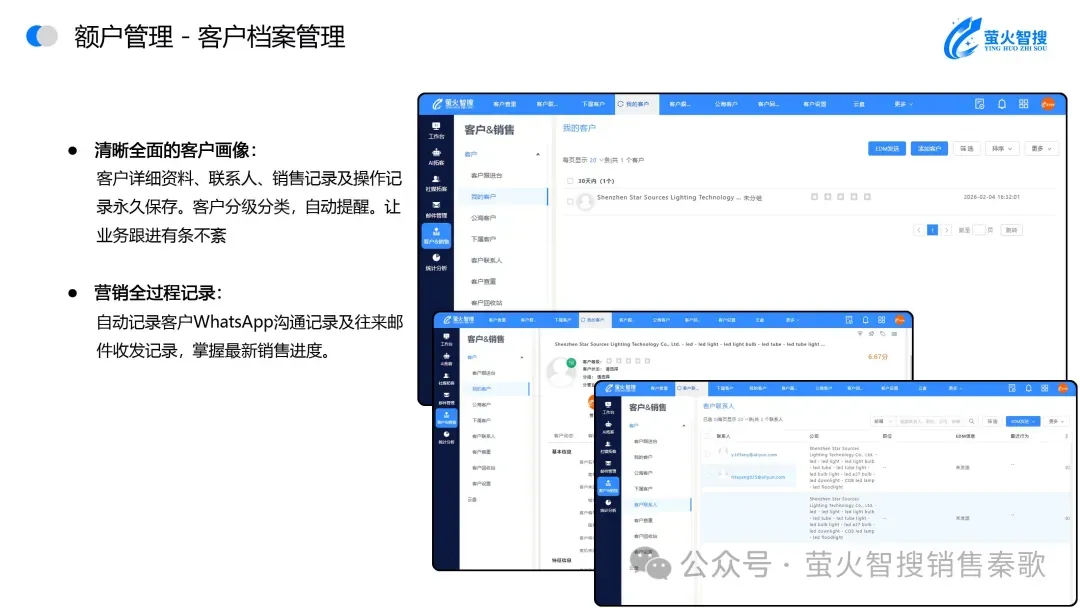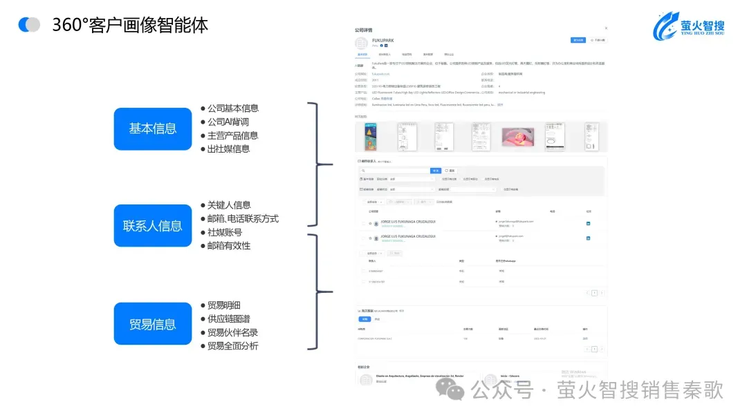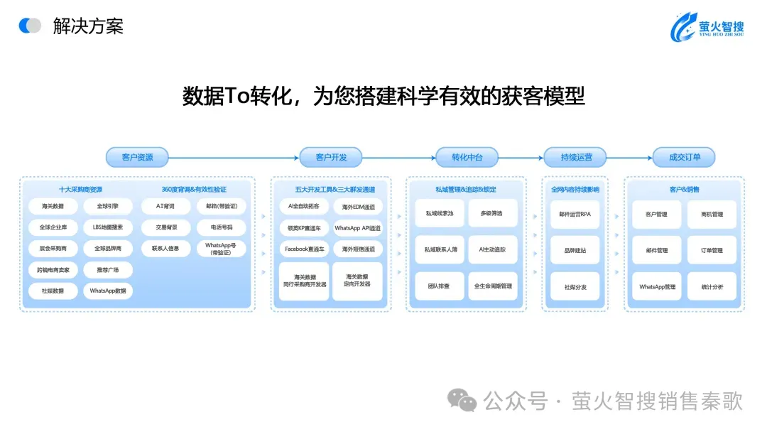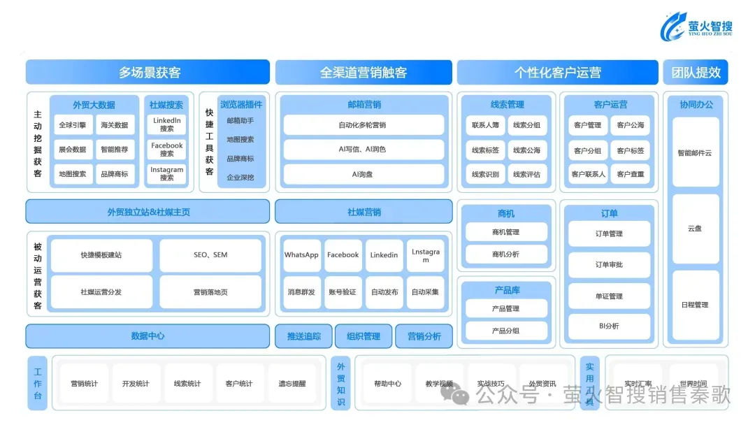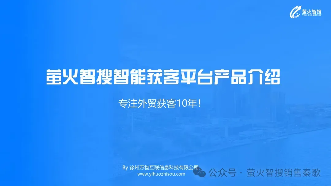 公司旗下品牌 -萤火智搜 - 包括,海关数据、海外社媒平台投放、社媒营销系统、品牌独立站、自动获客平台,谷歌地图找客户等十大客户开发渠道,以坚实数据根基为依托,全面运用前沿 AI 能力,为外贸行业量身打造易用高效的一体化营销平台,包括智能获客、客户开发、全周期管客等核心功能,帮助更多外贸企业节省成本、提升效率,顺利开拓全球市场,达成业务增长目标!