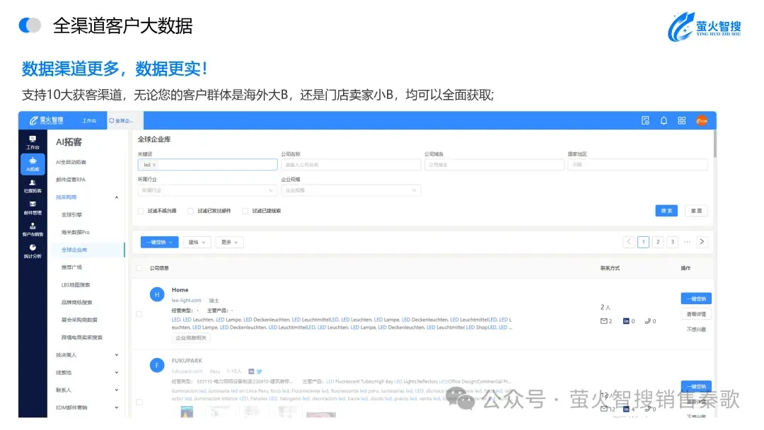 萤火智搜全渠道客户大数据,覆盖海关数据、全球企业库等十大获客渠道,不管是海外大 B 还是门店小 B,都能精准触达!多维度筛选,信息真实完整,一键开启全球获客,高效拿单!
