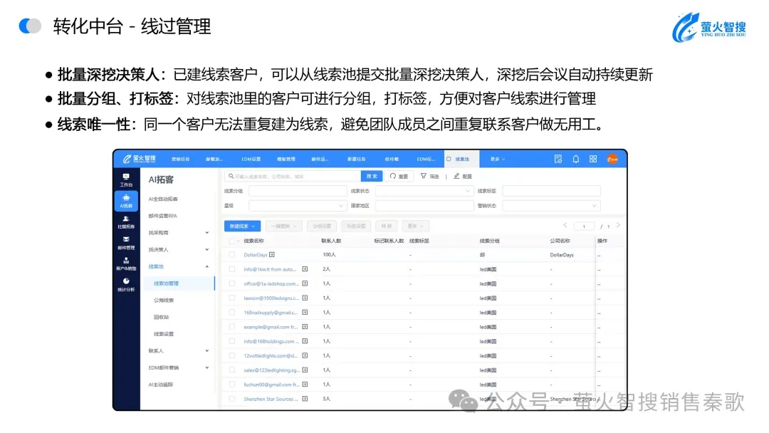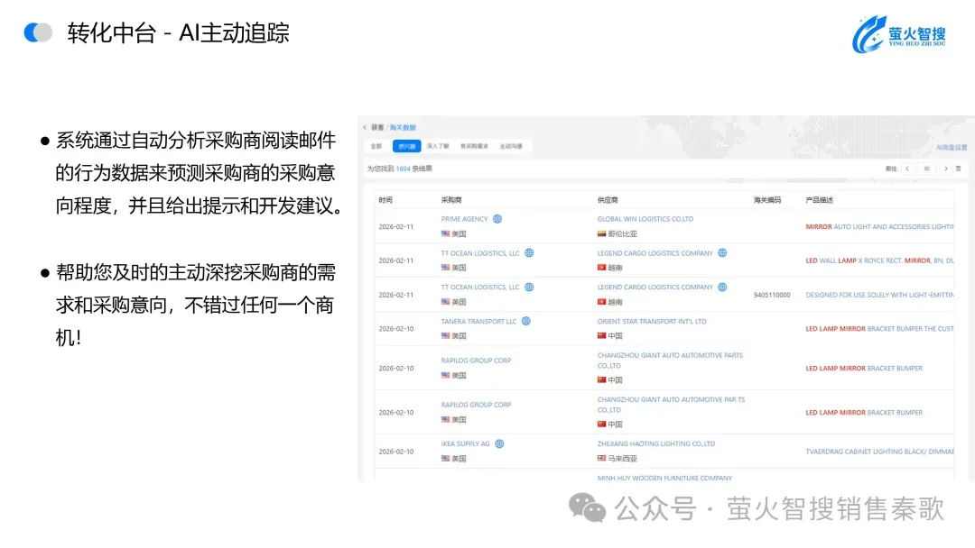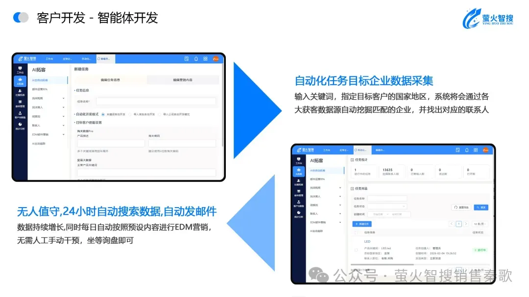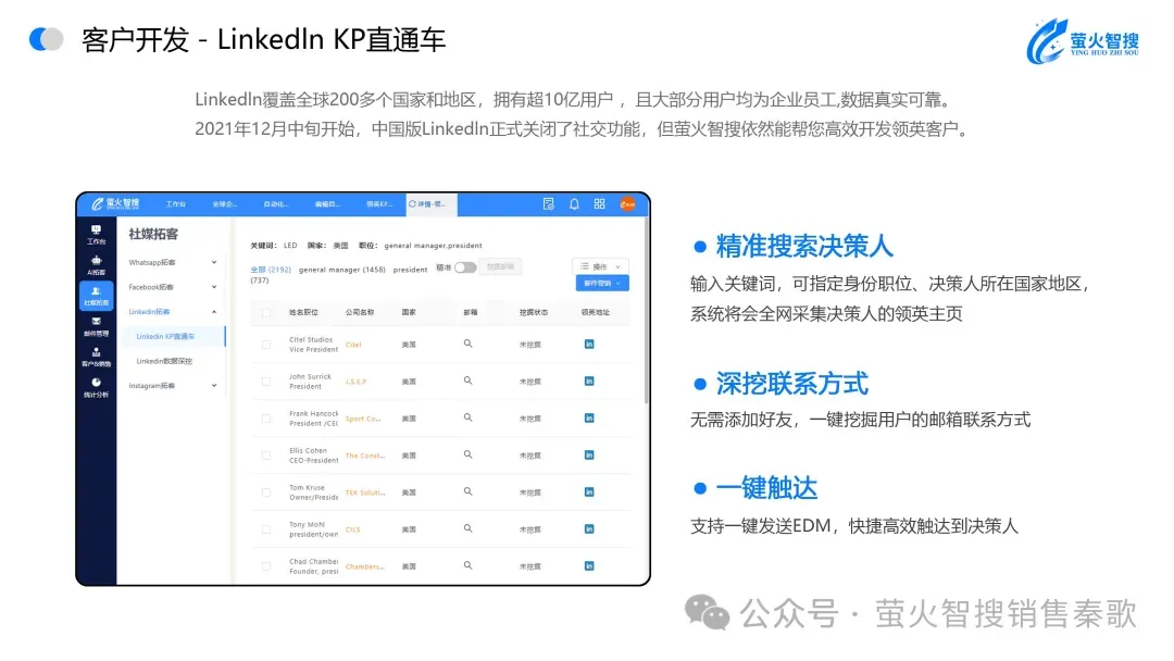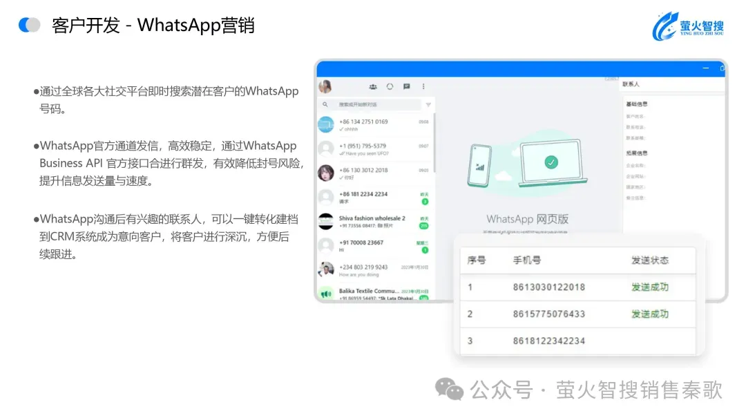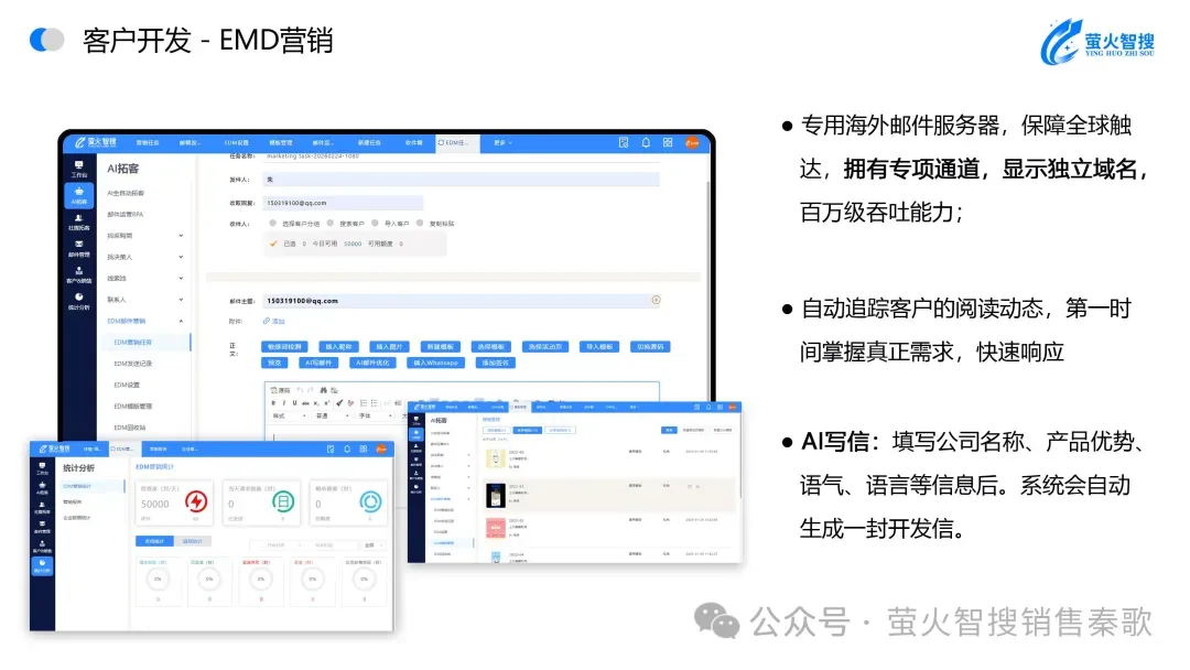 想真正读懂你的外贸客户?萤火智搜 360° 客户画像智能体,从公司基本信息、联系人信息到贸易数据,全方位拆解客户背景、采购需求和交易行为,让你精准把握商机,高效转化不盲目! 萤火智搜智能体开发,24 小时无人值守,输入关键词和目标国家,自动挖掘企业和联系人,还能按预设内容自动发 EDM 营销,你只管坐等询盘,高效获客就是这么简单! 想直接触达 LinkedIn 上的决策人?萤火智搜 LinkedIn KP 直通车帮你搞定!不用加好友,精准搜索总经理、总裁、采购等职位,一键挖掘邮箱联系方式,还能直接发送 EDM,高效开发领英客户,不错过任何优质商机! 外贸开发信还在手动写?怕发不出去?萤火智搜 EDM 营销,专用海外服务器,百万级发送能力!AI 帮你一键生成开发信,还能自动追踪客户阅读动态,精准把握需求,高效触达全球客户,坐等询盘! 外贸线索多又乱,团队还重复跟进?太浪费!萤火智搜线索管理,批量深挖决策人,还能分组打标签,线索唯一不重复,让团队协作更高效,精准转化每一条商机!还在用 WhatsApp 手动找客户?效率太低了!萤火智搜 WhatsApp 营销,一键搜索全球客户号码,官方 API 接口发信,安全高效不封号,沟通满意的客户,一键建档跟进,主动开发海外客户,成交就是这么快! 客户读了邮件没动静?是不是没兴趣了?萤火智搜转化中台,AI 主动追踪!自动分析客户阅读行为,精准预测采购意向,直接给你开发建议,不错过任何一个成交机会! 客户信息散、跟进乱,容易丢单?萤火智搜客户档案管理,360° 客户画像全掌握,从资料、联系人到销售记录永久保存,还能自动记录 WhatsApp 和邮件沟通,分级分类智能提醒,让业务跟进井井有条! 做外贸,邮箱多还容易乱?客户读了邮件没跟进?萤火智搜邮件管理功能,一步解决!支持多邮箱统一管理,实时追踪邮件打开次数、时间和地点,快速锁定商机,第一时间跟进!更能自动识别客户角色,避免团队内部重复沟通,让每一封邮件,都能精准转化成订单! 萤火智搜 AI 获客平台对比传统获客工具,优势显著:AI 全自动 24 小时获客,数据实时更新,支持多关键词多国检索,覆盖 50 + 国家海关数据;可深挖决策人多渠道联系方式,提供安全高效的海外 EDM、WhatsApp 及社媒私域营销通道,一站式解决外贸获客难题,效率与精准度远超传统工具。 你如果想 免费| 体验