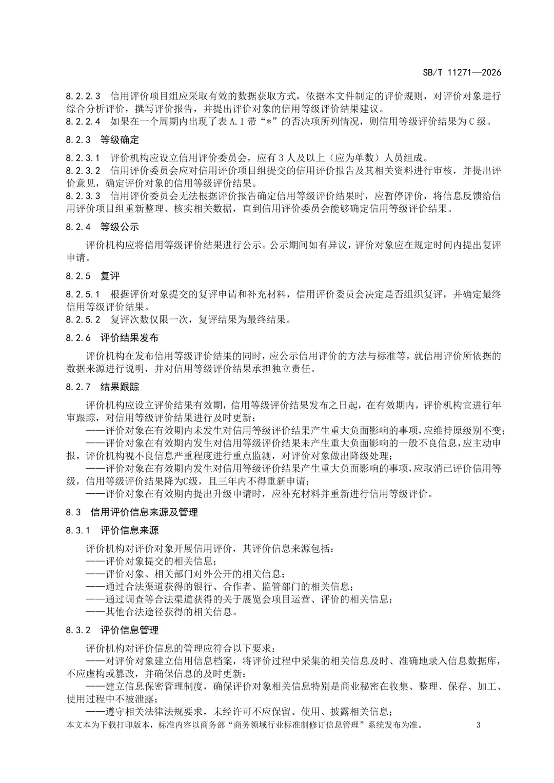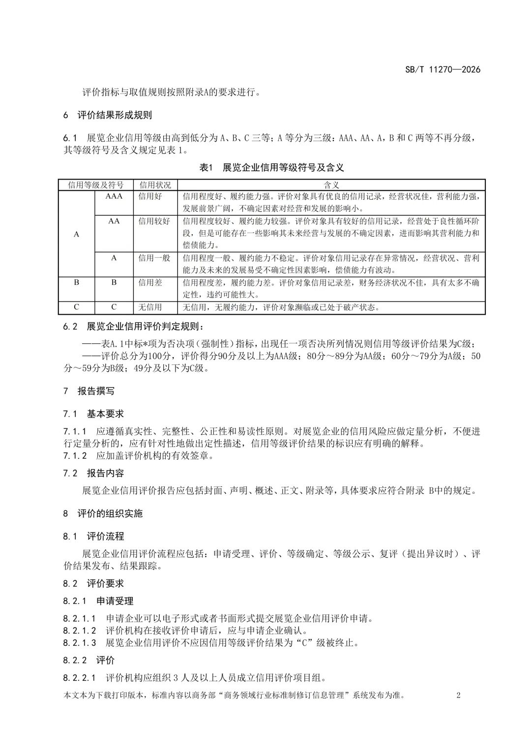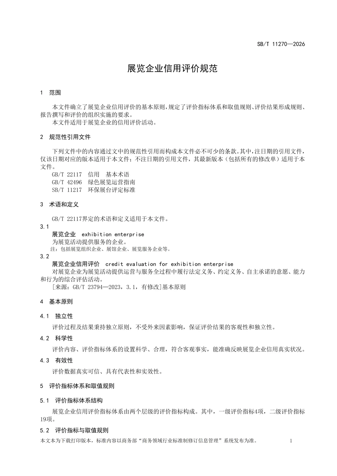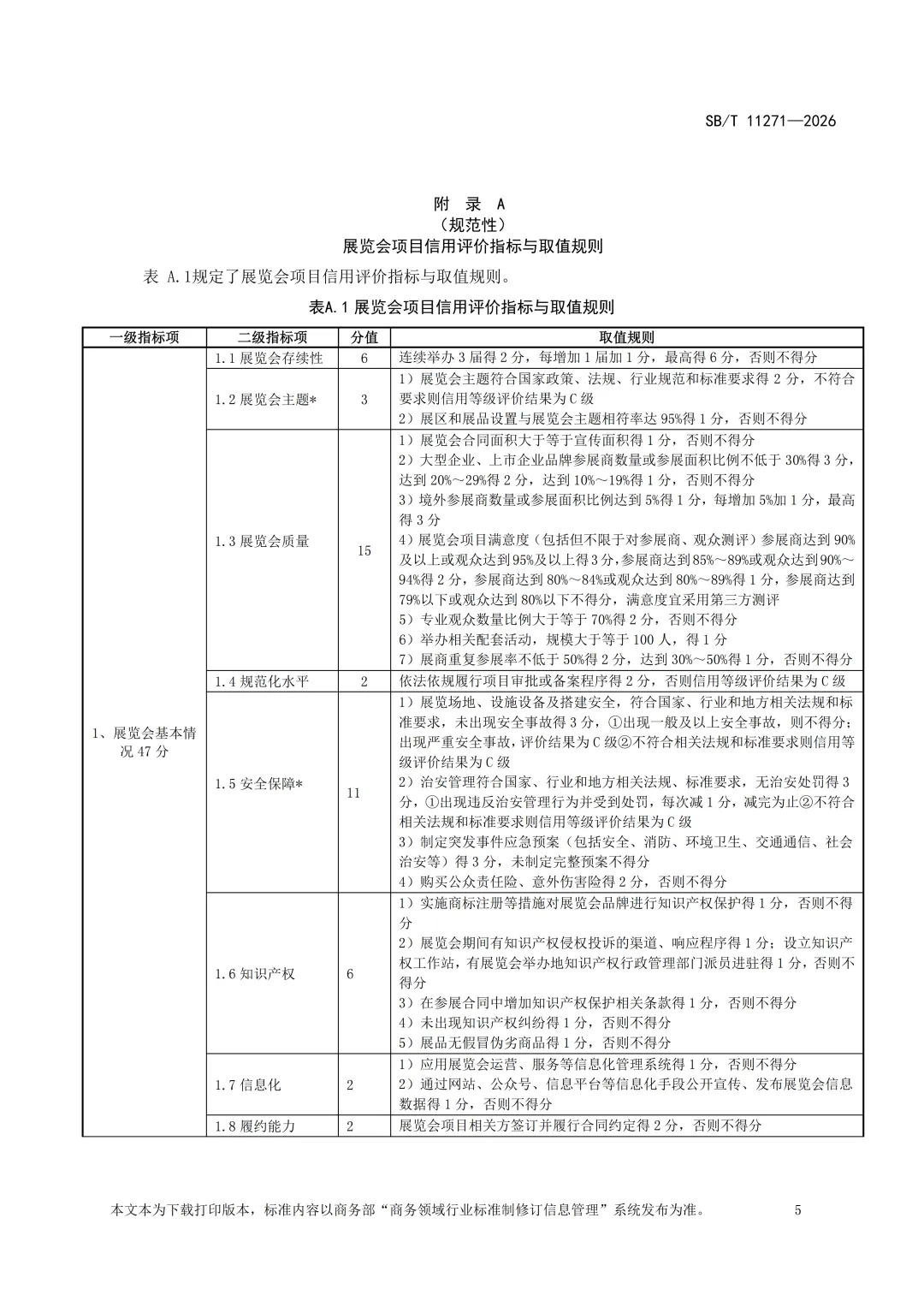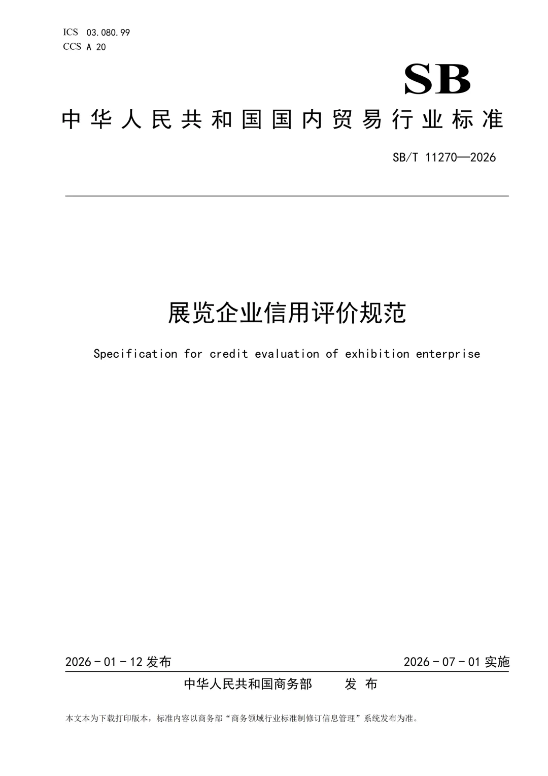 《展览企业信用评价规范》、《展览会项目信用评价规范》行业标准经起草单位调研、起草、研讨和修改完善后,现已正式发布,将于2026年7月1日起实施。两项标准分别确立了展览企业信用评价、展览会项目信用评价的基本原则,规定了评价指标体系和取值规则、评价结果形成规则、报告撰写和评价的组织实施的要求。