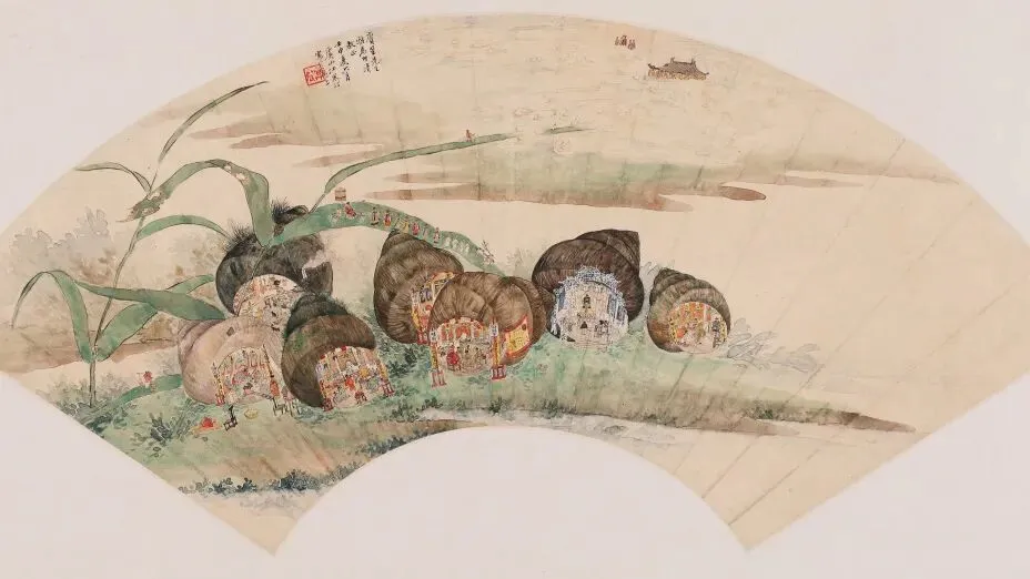 江寒汀的《螺蛳壳里做道场》扇面是一幅极具创意和技艺的画作。这幅画生动地描绘了“螺蛳壳里做道场”这一俗语所表达的情景,即在狭小简陋的空间里进行复杂宏大的活动。在这幅扇面中,精彩的细节让人惊叹,江寒汀巧妙地利用方寸之间的空间,画了七个螺蛳壳,并在其中描绘了近七十个道释人物。这些人物或做法事,或吹拉弹唱,或烹煮食物,或穿梭其间,形成一派热闹景象。同时,他还精心绘制了做法事的法器、布幔、火盆,灶头上煮的饭菜,墙上挂着的鸡、鸭、火腿等细节,甚至仪仗队牌子上的“肃静”“锡福”等字也一一绘出,展现出他深厚的绘画功底和细腻的观察力。“螺蛳壳里做道场”是吴语地区的俗语,螺蛳壳里做道场是指在狭窄简陋处做成复杂的场面和事情。