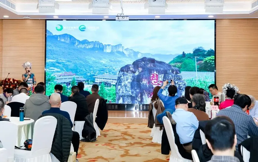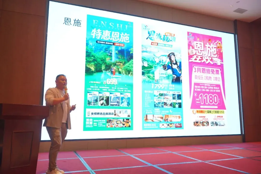 恩旅集团推介官详细介绍了恩施大峡谷、大清江、坪坝营等核心景区。江西省卓乐国际旅行社现场发布了上饶至恩施的精品旅游线路,涵盖核心景区与特色体验。