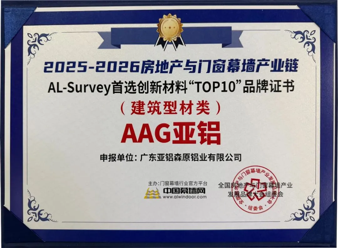 本次评选由行业权威机构主办,依托AL‑Survey 年度调研体系,汇聚产业链权威专家、头部房企、幕墙及门窗企业等多方评审力量,围绕产品质量、技术创新、服务能力、品牌口碑、市场应用等核心维度开展综合评审。评选过程专业严谨、结果权威公正,既是衡量企业综合实力与行业首选度的重要标尺,也是市场采购、品牌选型的权威参考风向标。AAG亚铝凭借强劲综合实力再度上榜,成功蝉联并入库房地产与门窗幕墙产业链AL‑Survey 首选创新材料“TOP10”品牌。这一荣誉,是市场与行业对AAG亚铝长期深耕主业、坚持技术创新、持续领跑行业的高度认可与权威肯定。