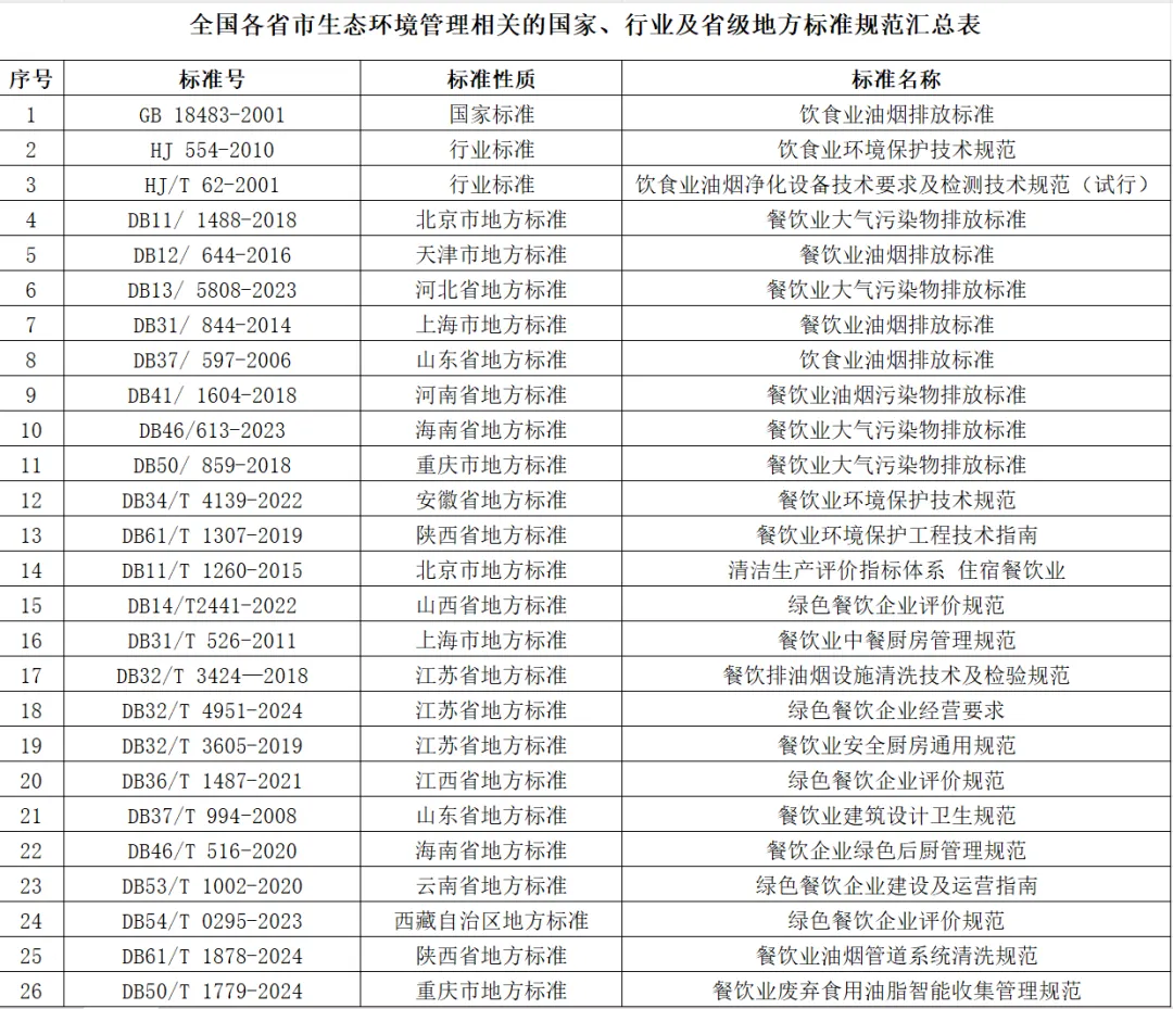 为了帮助广大餐饮企业、设备厂商及相关从业者更清晰地了解行业要求,行业内标准分散、信息不对称的痛点,餐饮环保相关标准涵盖国家、行业、地方三个层级,且各地要求差异较大、更新频繁,小编通过系统梳理,将分散的标准整合在一起,为行业同仁提供一份清晰、实用的标准“导航图”,这份全国餐饮环保相关标准汇总表,涵盖国家、行业及地方标准共26项。