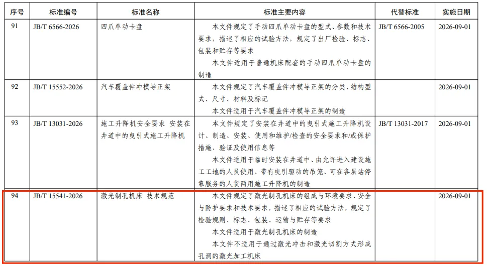 2026年3月,行业标准《激光制孔机床技术规范》(编号:JB/T 15541-2026)正式获得工业和信息化部批准发布。该标准于2023年列入工信部《2023年第三批行业标准修订和外文版项目计划》,由西安中科微精光子科技股份有限公司牵头,联合中国科学院西安光学精密机械研究所等多家行业优势单位共同编制完成,是中科微精首次作为牵头单位完成的行业标准,将于2026年9月1日正式实施。