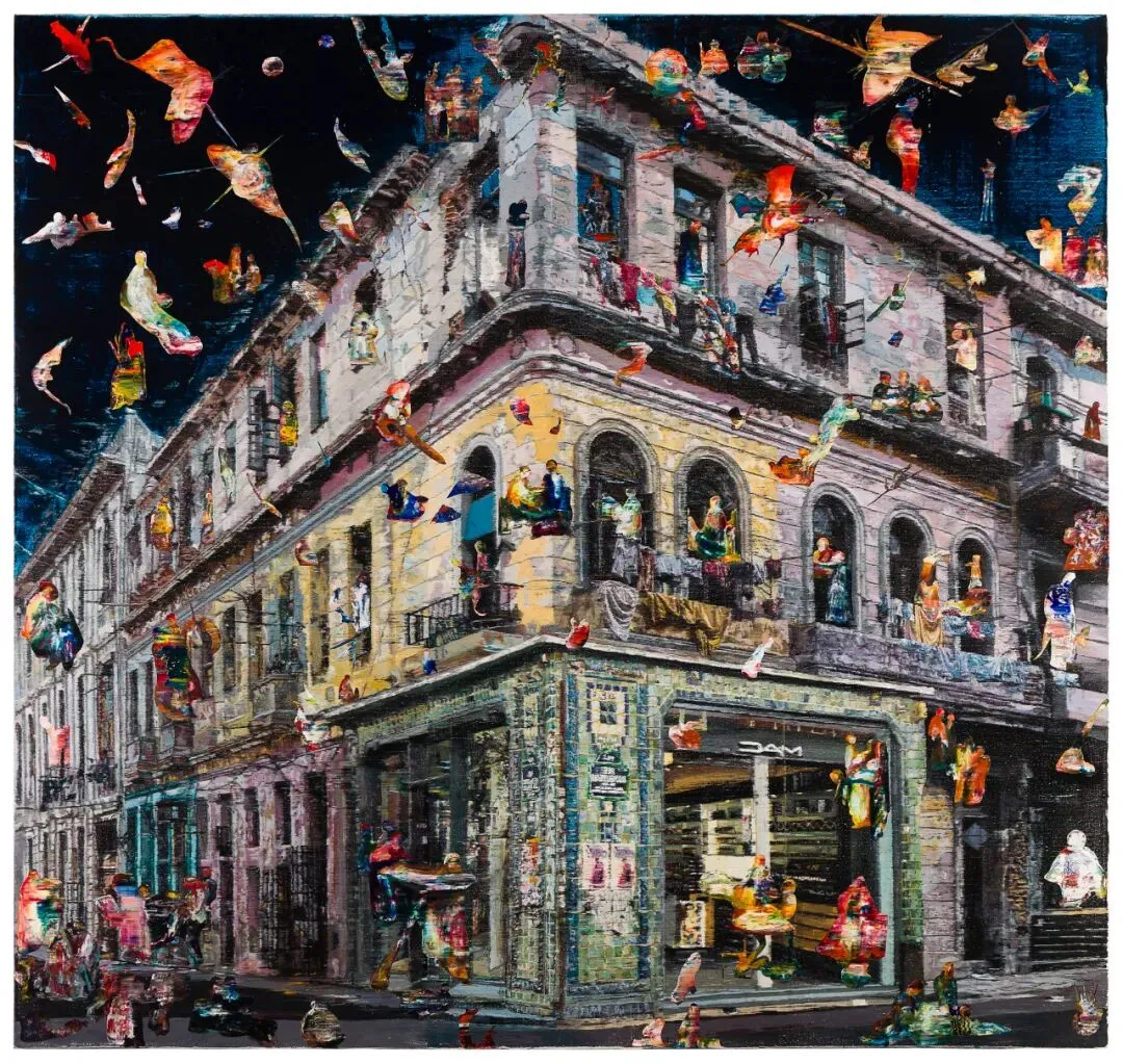 展位亮点包括袁远受感于法国作家安德烈·纪德同名著作的大尺幅新作《人间的食粮》(2026)。此幅描绘了喧嚣都市景象的绘画作品的创作基础是一幅在上海街角拍摄的情境,而其中的主要建筑则源于袁远在古巴旅行时于哈瓦那海滨大道上目睹的一处破败建筑——那建筑几近废弃,门窗均已缺失,但人们仍在其中居住,而路人可在街上一瞥他们的日常生活。