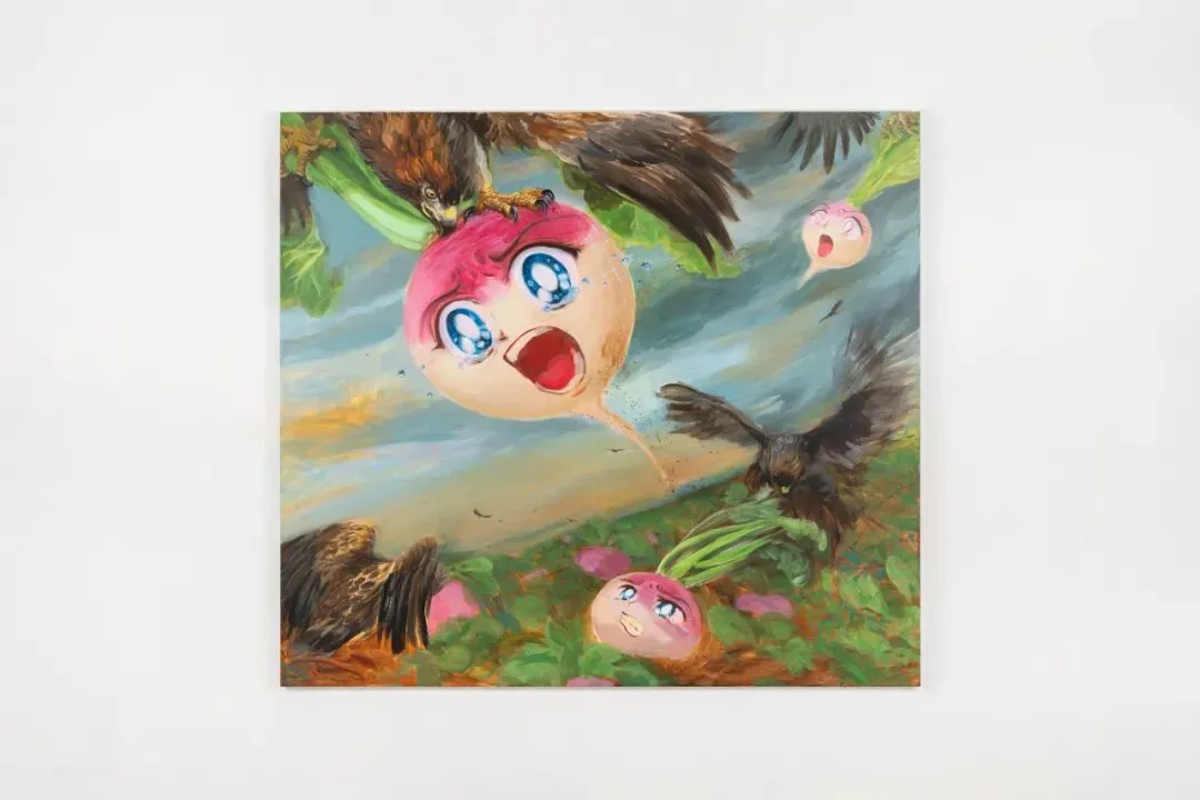 刘茵,《素食者鹰掠夺天真萝卜》,2025-2026,布面丙烯,180 x 200 cm