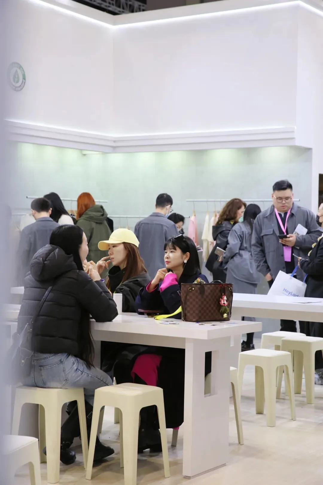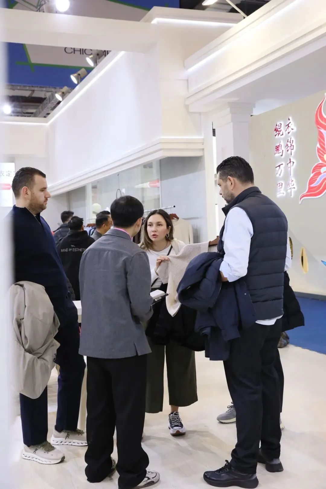 位于4.1M016的服装大摊位(主要摊位):男女装成衣系列与春夏毛衫新品交相辉映,三日累计接待客商超千人次,成为CHIC展馆当之无愧的人气焦点。现货供应的春夏毛衫系列,涵盖莱赛尔、6羊毛、30羊毛、半精纺全毛、百德斑点亚麻、竹节麻等多款产品,凭借丰富的品类与快速交付的优势,赢得了众多品牌客户的青睐。