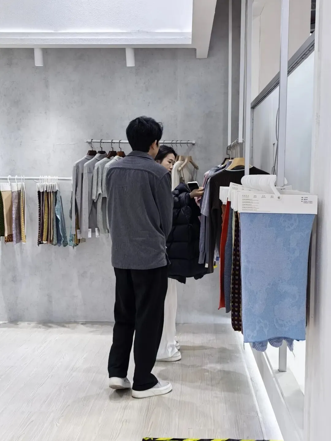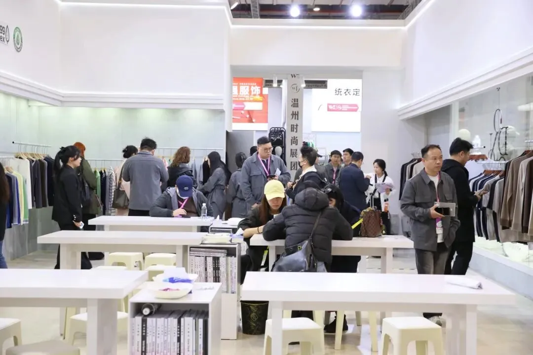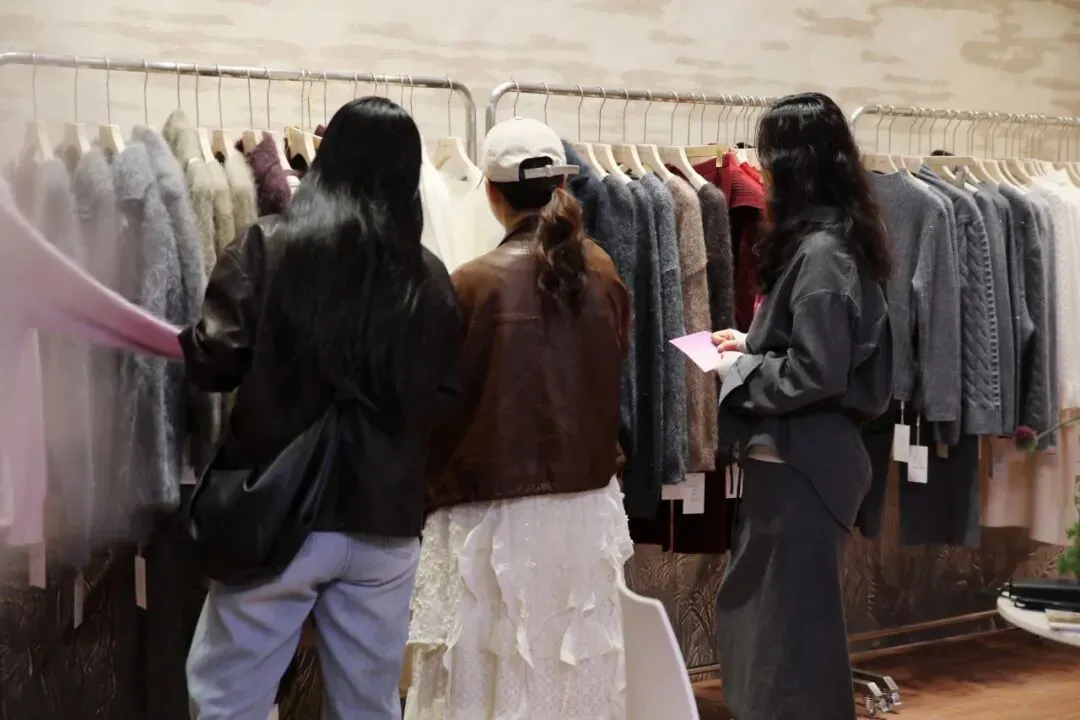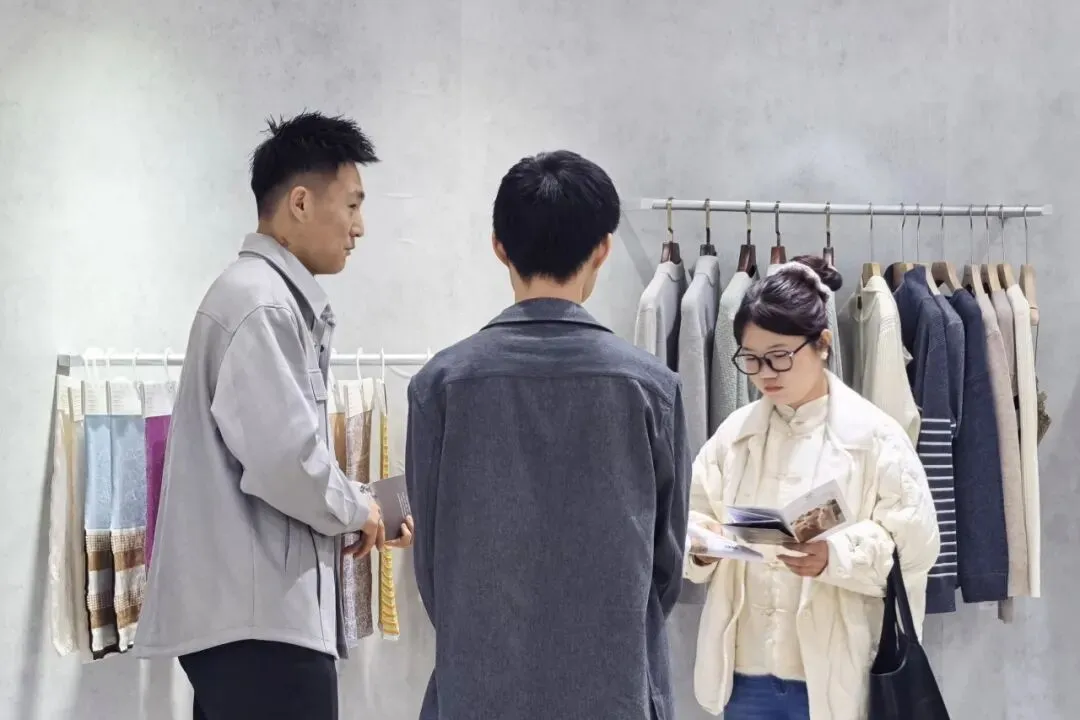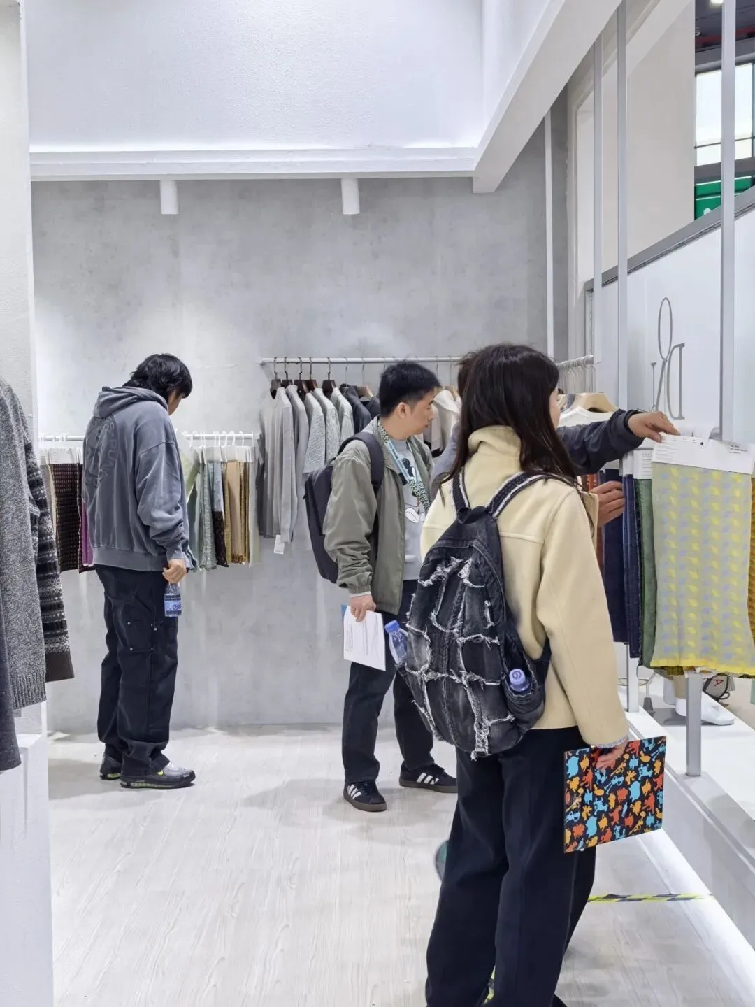 位于1.1F512的濮院女装摊位:羊绒衫系列以其经典的品质与时尚的设计持续吸引专业买家。不少客户现场完成选款,并预约展后深入沟通打样与订货事宜。