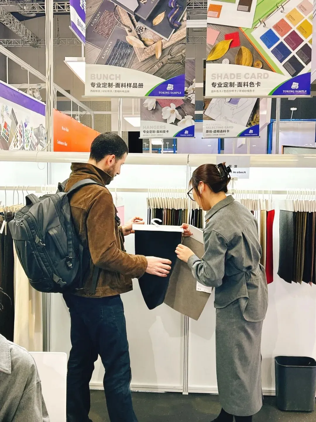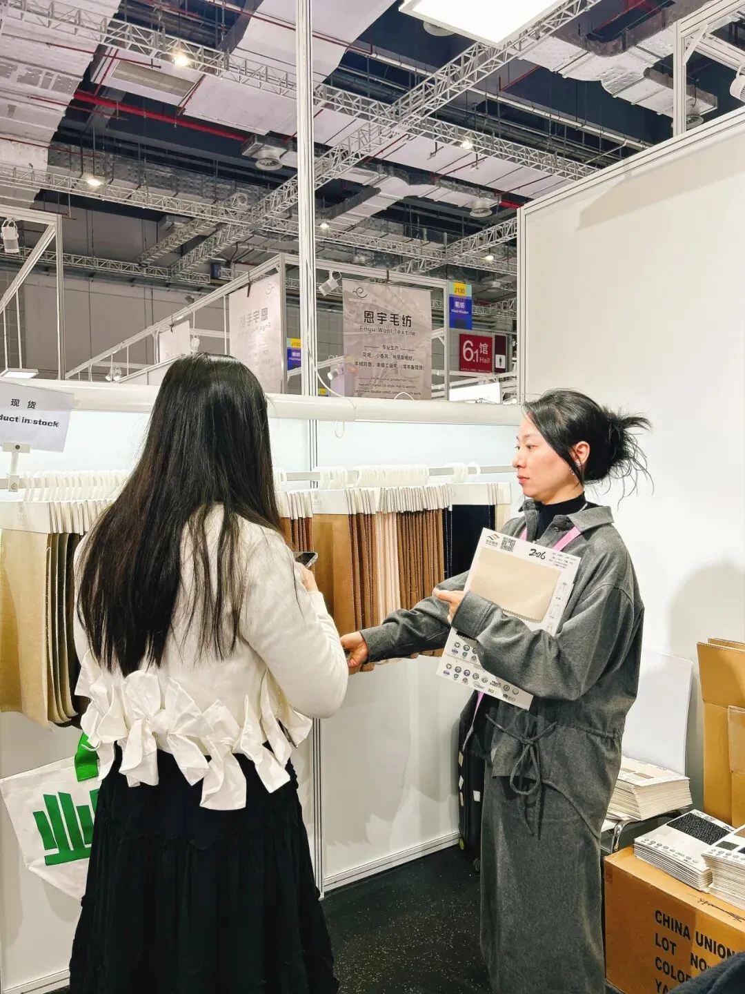 位于6.1K125的面料展位:时装呢与双面呢两大系列凭借澳洲进口美利奴羊毛的卓越品质、经典的人字纹花型、挺括有型的双面呢质感,让众多品牌设计师流连忘返,多位客户现场完成采样。