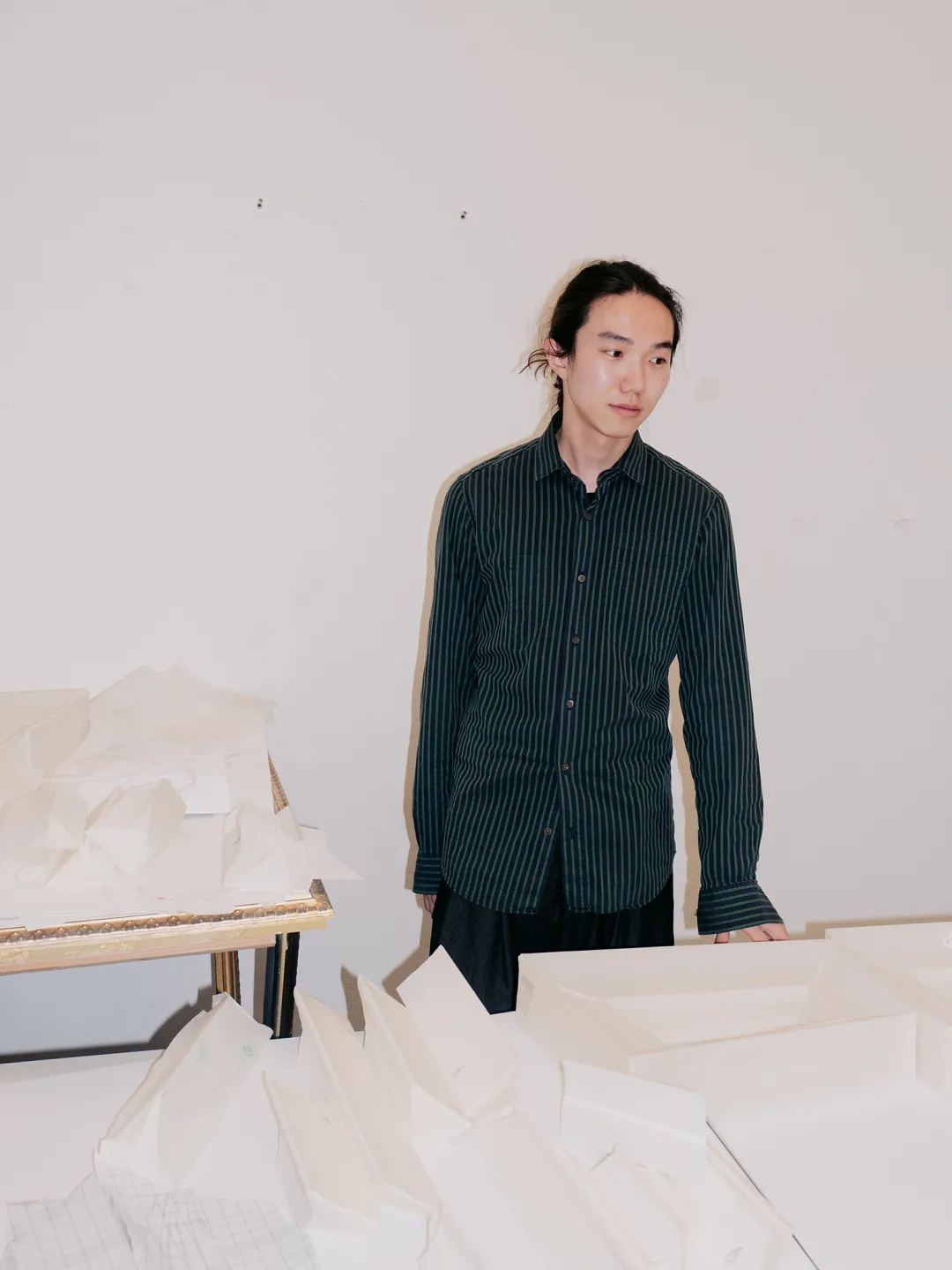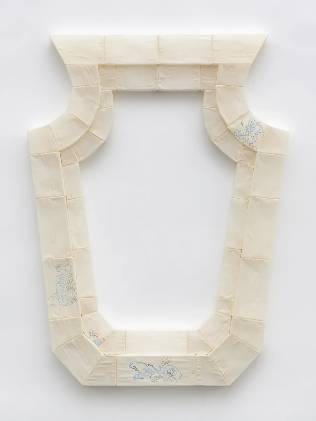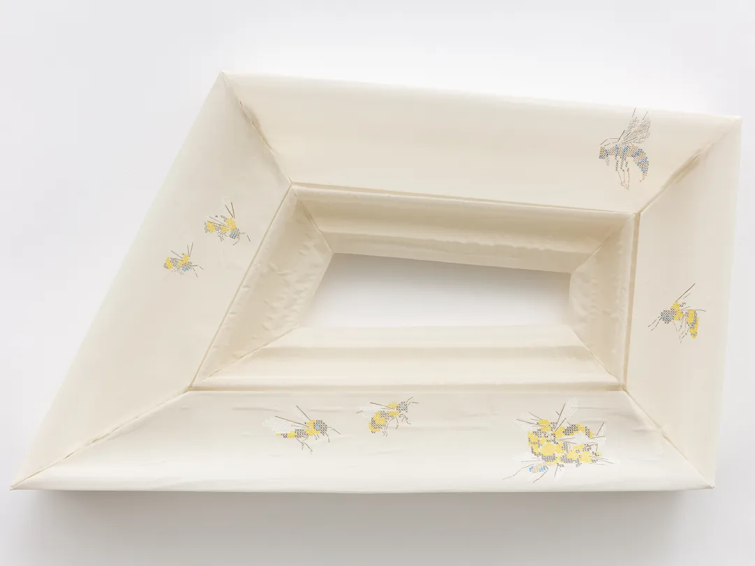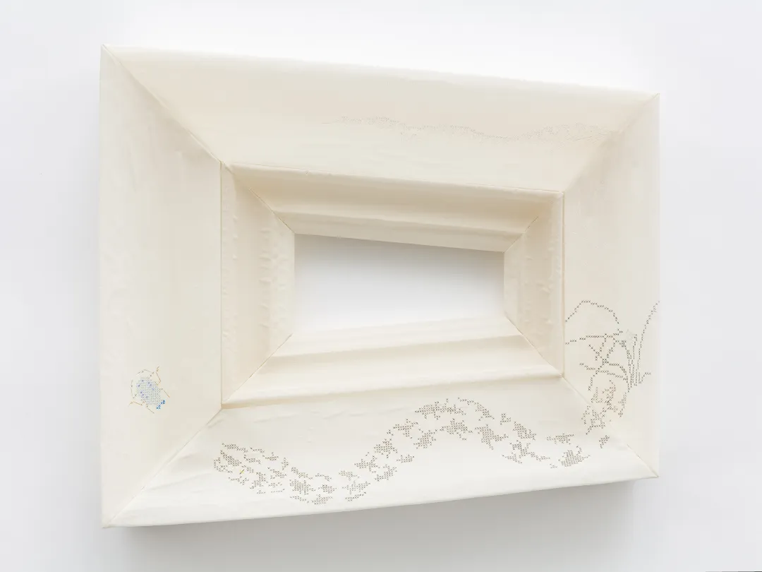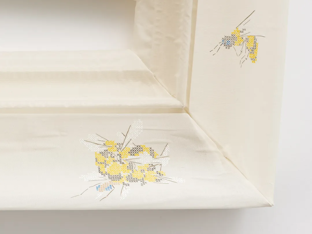 藝術家不斷演進的創作實踐中融合了時尚、雕塑和繪畫。他從工筆畫、西方裝裱和十字繡中吸取靈感,並將這些傳統的技法調和成了和諧的視覺語言,使日常物品轉化為量身定制的結構骨架。