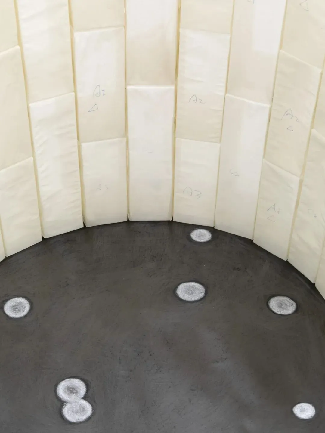 這些堅韌的作品需要通過一個激烈的過程打造。絹被施加於雕塑表面,承受極度的張力;當內部結構被移除後,只留下空心的形體,顯現深刻的缺席感。懸停於悖論中的這些空殼,被排列成一條蛇的姿態,環繞在一口雙井旁。石墨繪出水之幻影,靜靜地倒映著民俗傳說的逸聞。這些密集勞動所留下的細微痕跡,成為了一個個空心的居所,而藝術家創造的幽靈徘徊其中。