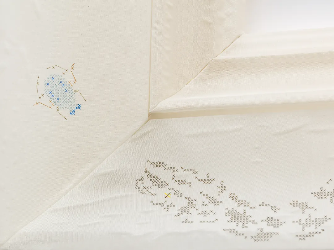這一視角框定了藝術家與法蘭克福翻新的中式園林「貝特曼公園」(Bethmann Park)的相遇經歷,他將其視為一種文化摩擦的場域。通過十字繡繪畫,劉蘇描繪了花園生態中的權力關係,刻畫著這片離散世界中對於「可見性」的追求。這些故事逐漸展開為一種廣泛的內省,質詢著「懷舊」這一危險的文化母題,並指出:對於可見性的渴望,或許比可見性本身更為重要。