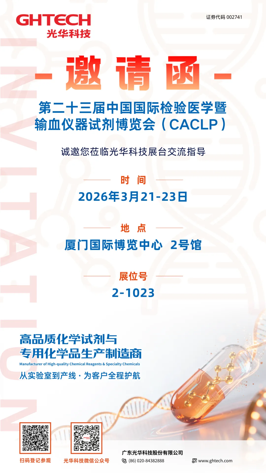 2026年3月21日-23日,第二十三届中国国际检验医学暨输血仪器试剂博览会(CACLP)将在厦门国际博览中心盛大举行。GHTECH光华科技将携高品质医药产线专用化学品解决方案,在2号馆1023展台精彩亮相。诚邀业界同仁现场交流,共襄盛会!