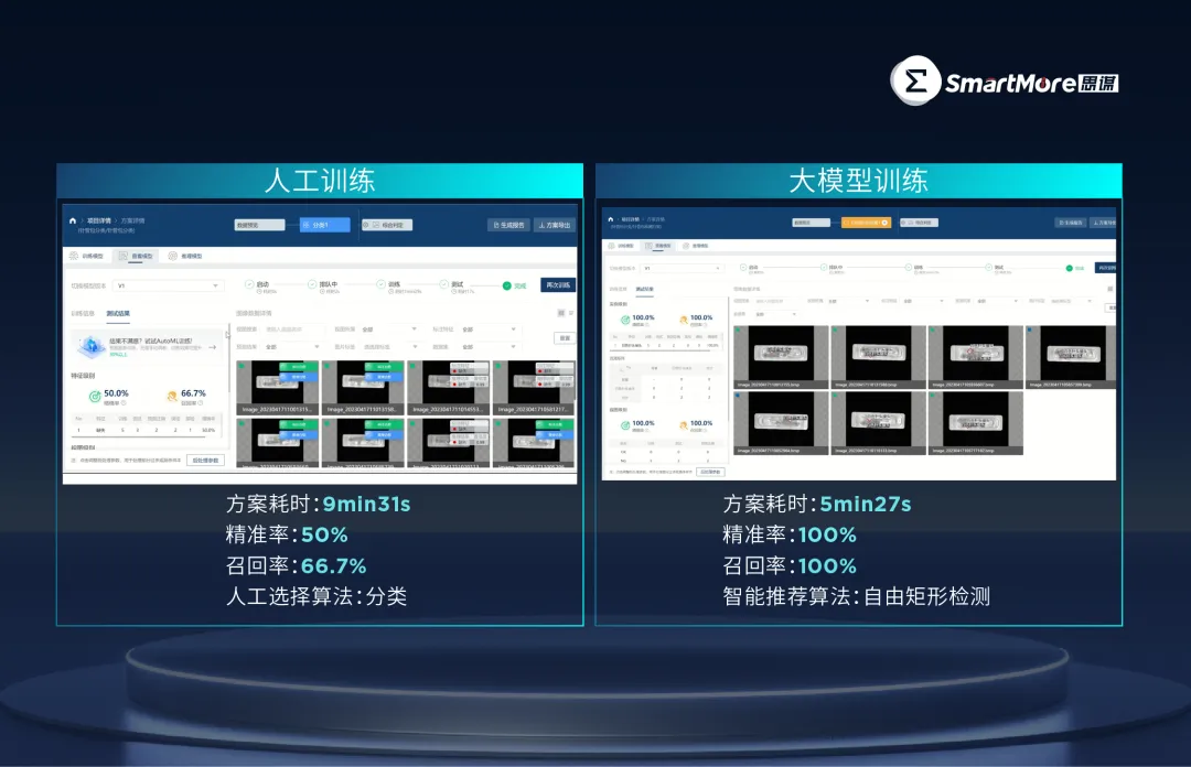 在与软件沟通上,IndustryGPT革新了工业软件操作及交互方式。以思谋SMore ViMo为例,这是一款端到端的工业智能通用型平台,打通了从模型生产到部署应用的全流程,积累了超1000个细分行业场景。在学习SMore ViMo平台的技术文档后,IndustryGPT可理解机器学习模型开发流程,在接收用户的自然语言命令时,驱动ViMo智能推荐、自动创建算法方案,并完成数据标注、调参、训练等操作。在某分类检测案例中,IndustryGPT选择的方案耗时5分钟27秒,且精确率和召回率均达100%,而人工训练下方案耗时长达9分钟31秒,精确率仅50%、召回率66.7%。