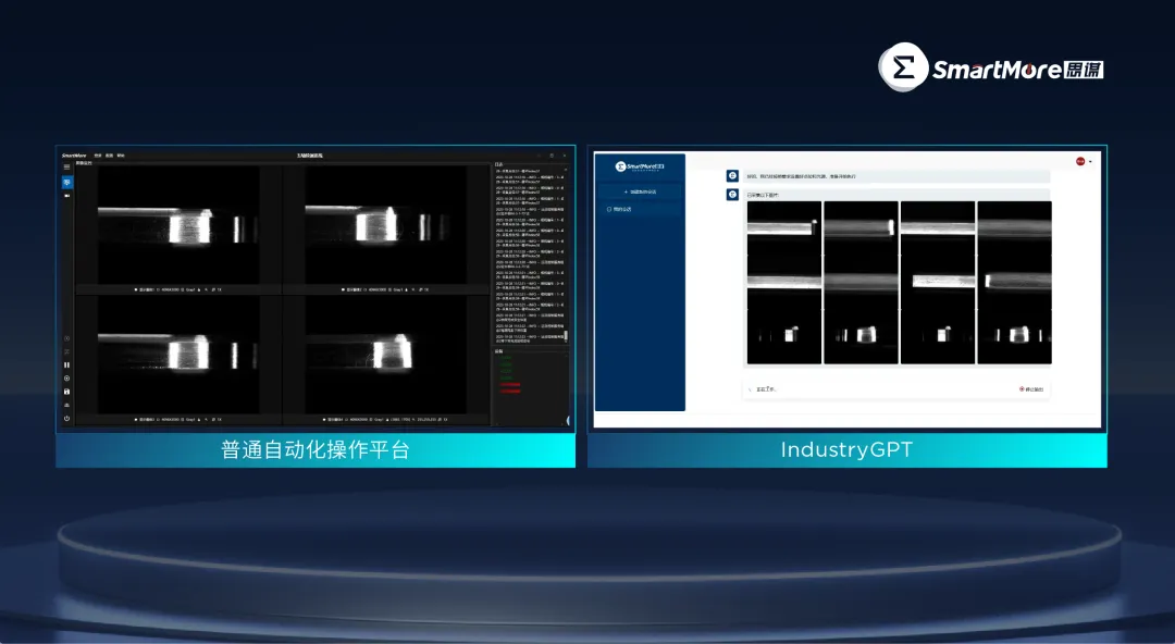 在与硬件沟通上,IndustryGPT还改变了数字世界与物理世界的连接方式。以手机中框质检设备的采图为例,传统自动化操作平台需要运营人员花费至少2小时去完成点位设置、采图作业、效果验看、参数调整等流程。而正在研发的使用IndustryGPT驱动硬件智能设备的功能,用户使用自然语言下达指令,通过几次简单对话,最快5分钟完成任务。