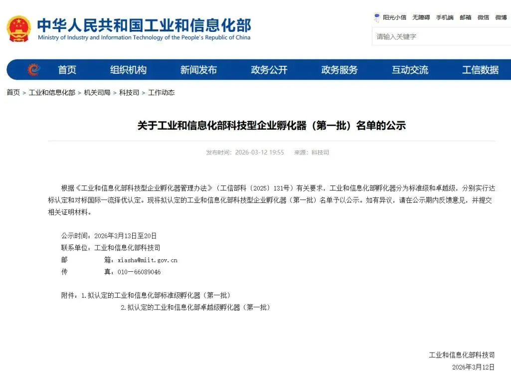 根据《工业和信息化部科技型企业孵化器管理办法》(工信部科〔2025〕131号)有关要求,工业和信息化部孵化器分为标准级和卓越级,分别实行达标认定和对标国际一流择优认定。现将拟认定的工业和信息化部科技型企业孵化器(第一批)名单予以公示。如有异议,请在公示期内反馈意见,并提交相关证明材料。